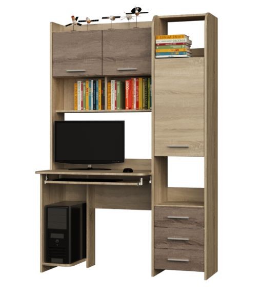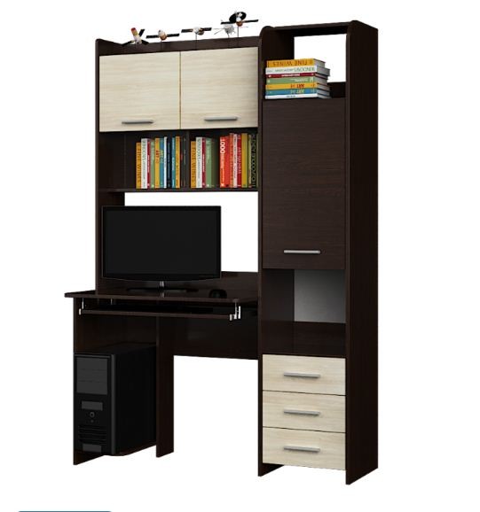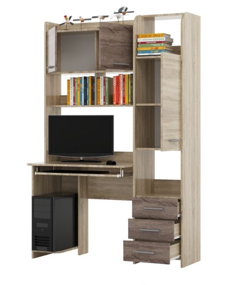 В комплект входит три выдвижных ящика, открытые и закрытые полки. Подставки под монитор, клавиатуру и системный блок позволят удобно разместить компьютер. Вполне адекватная цена за такой функционал вас приятно порадует. Материал - ДСП Варианты изготовления: венге темный + дуб молочныйдуб сонома+дуб трюфель Габаритные размеры компьютерный стол Гимназист 2; - ширина - 1250 мм; - глубина - 550 мм; - высота - 1886 мм Мебель доставляется в разобранном виде в фабричной упаковке. В комплекте фурнитура для сборки, схема изделия. Отверстия для сборки просверлены.