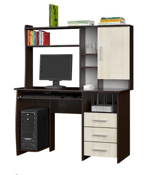 В комплекте есть выдвижная полка на роликовых направляющих и подставка под системный блок. Сочетание контрастных цветов дуб венге и дуб молочный изысканно подчеркивает современный дизайн. Вам обязательно понравиться широта рабочего пространства и вместительность комплекта. Материал - ДСП Цвет: венге темный + дуб молочный Размеры: (ШхВхГ) Стол- 1250 х1480х600 мм; Мебель доставляется в разобранном виде в фабричной упаковке. В комплекте фурнитура для сборки, схема изделия. Отверстия для сборки просверлены.