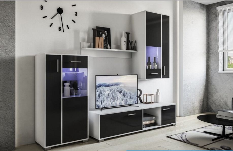 Гостиная БРУКЛИН СВІТ МЕБЛІВ – практичный комплект в гостиную Brooklyn Svit Mebliv Украина». Изготавливается из ДСП в цвете: корпус – белый, фасад – черный глянец. Комплектуется подсветкой.