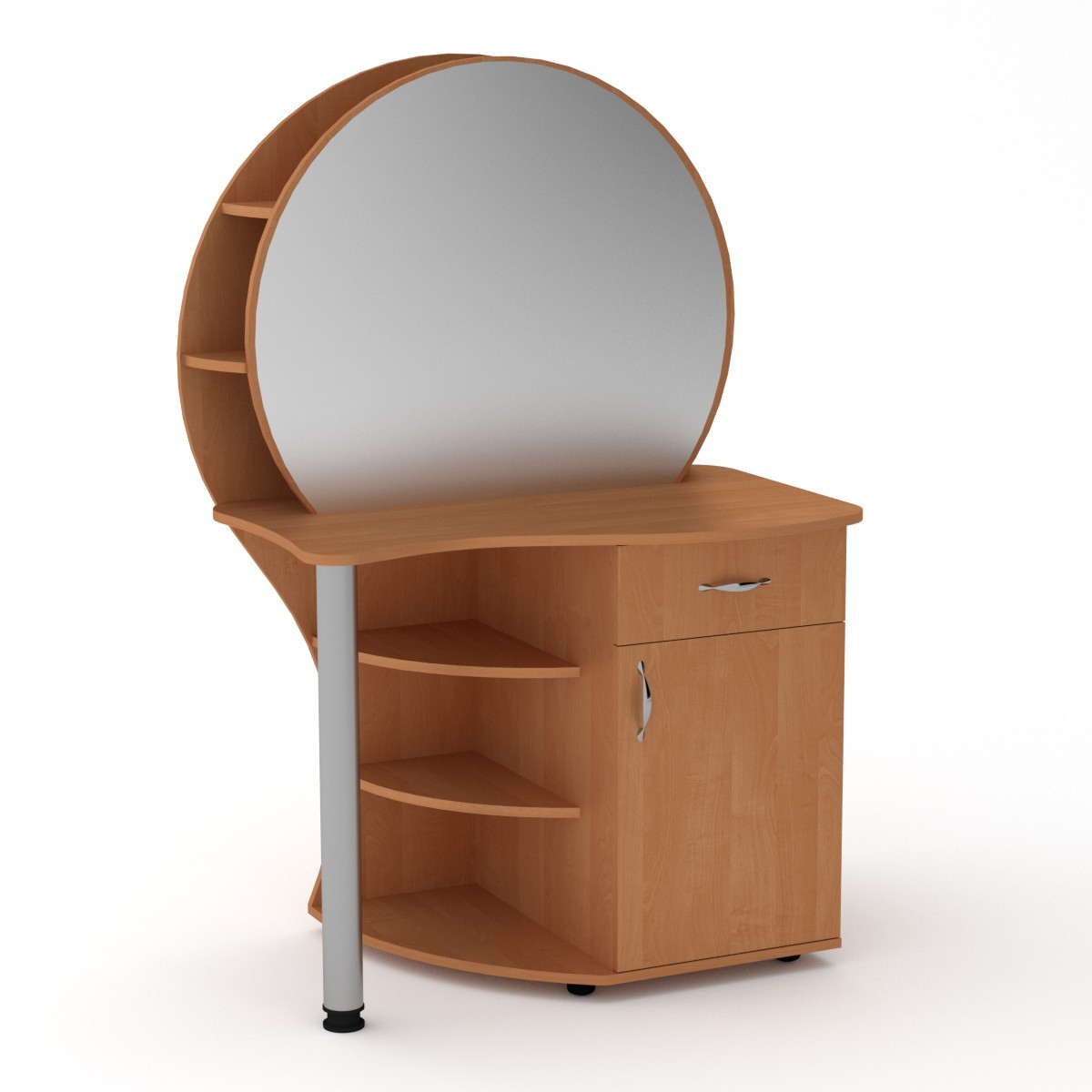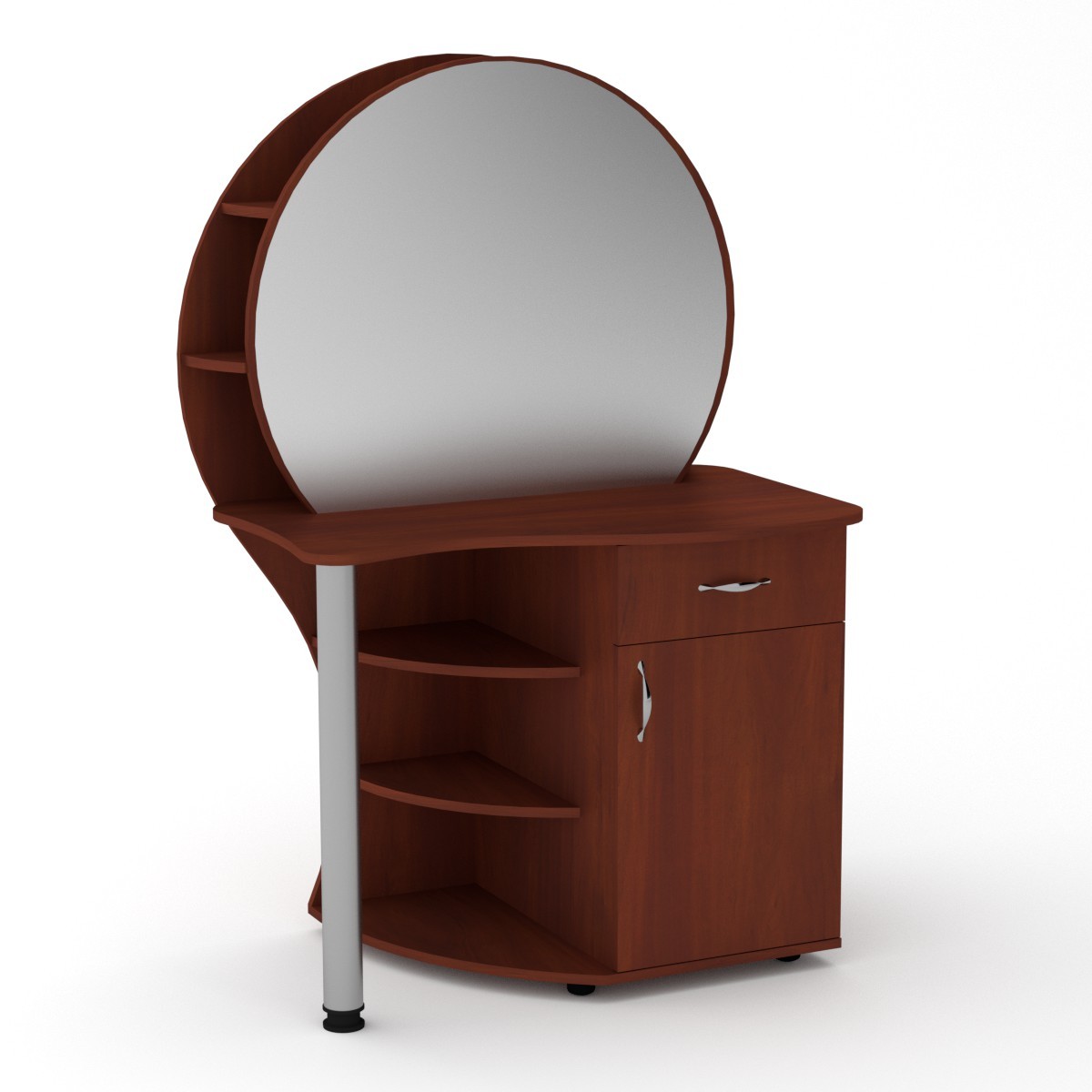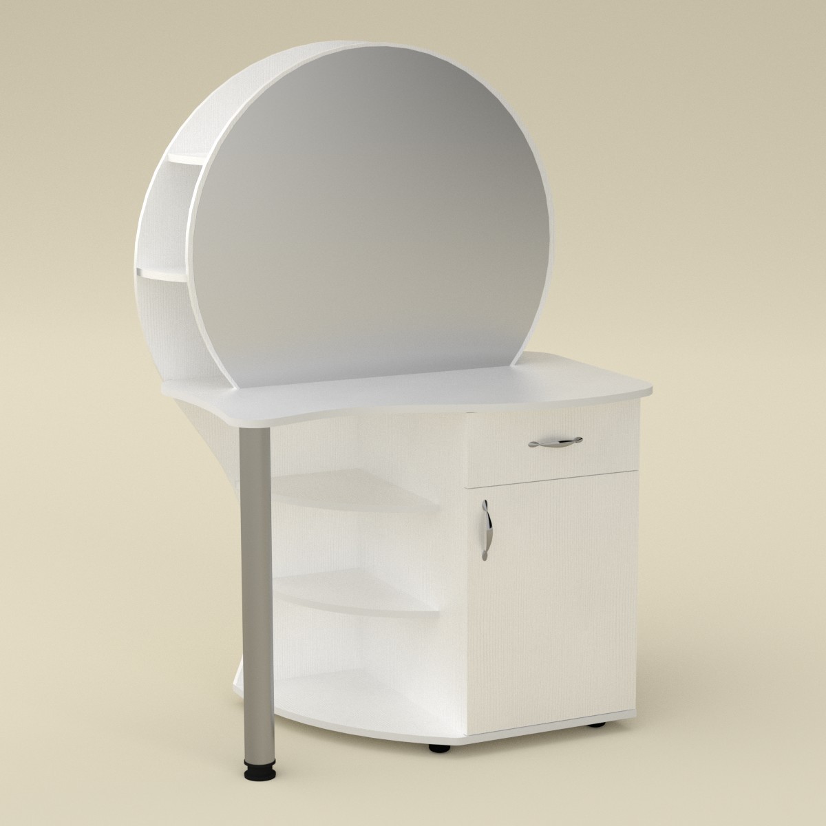 Данное трюмо - это оригинальное дизайнерское решение при оформлении спальни. Особенностью этого трюмо является наличие двух глубоких полок за зеркалом. Также имеется тумба с распашной дверцей с полочками и выдвижным ящиком. Дополнительно имеются открытые радиусные полки.