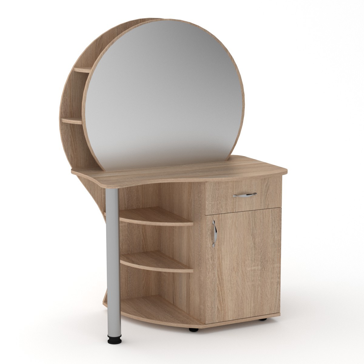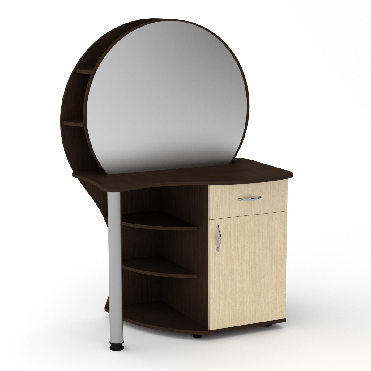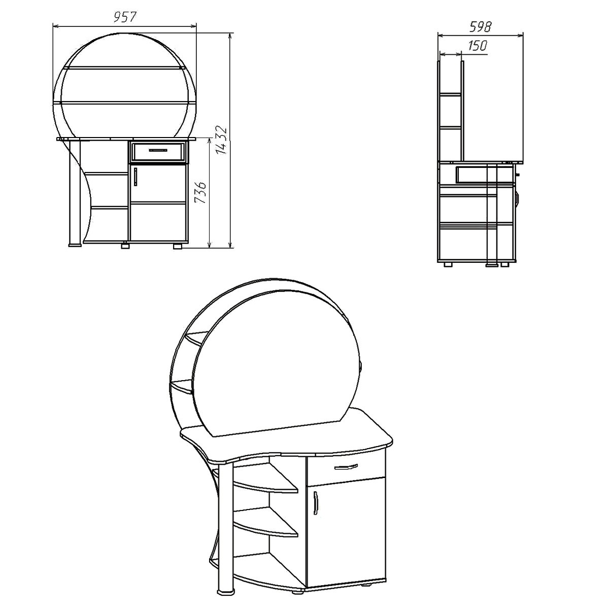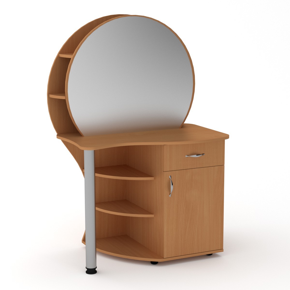 Данное трюмо - это оригинальное дизайнерское решение при оформлении спальни. Особенностью этого трюмо является наличие двух глубоких полок за зеркалом. Также имеется тумба с распашной дверцей с полочками и выдвижным ящиком. Дополнительно имеются открытые радиусные полки.
