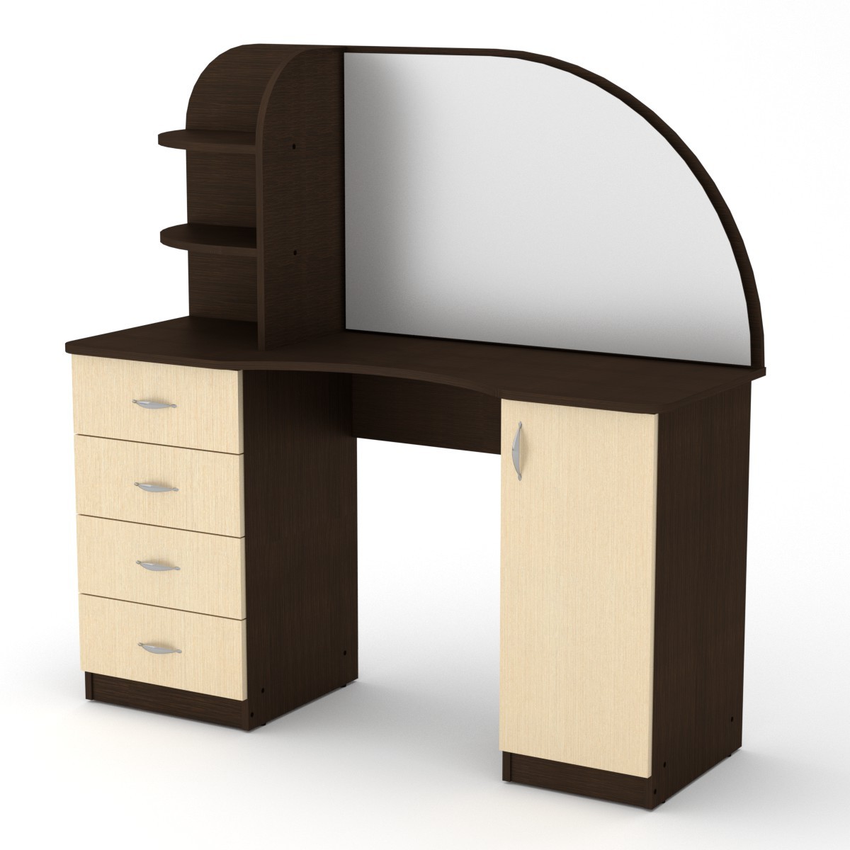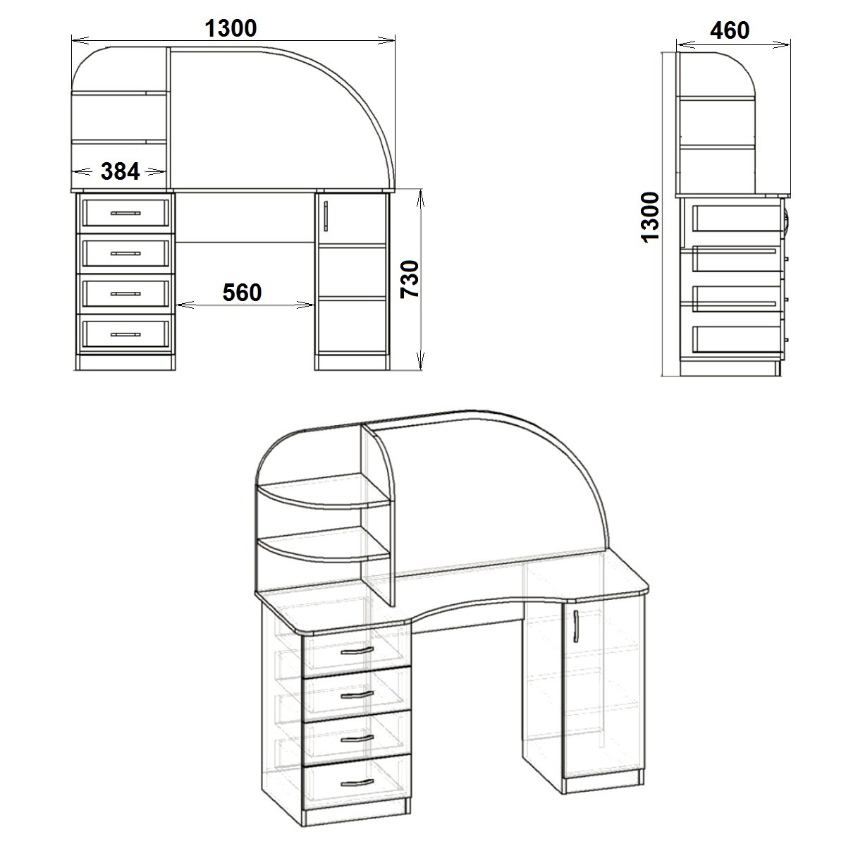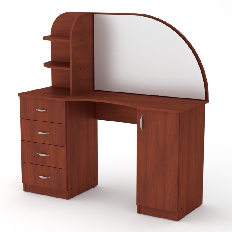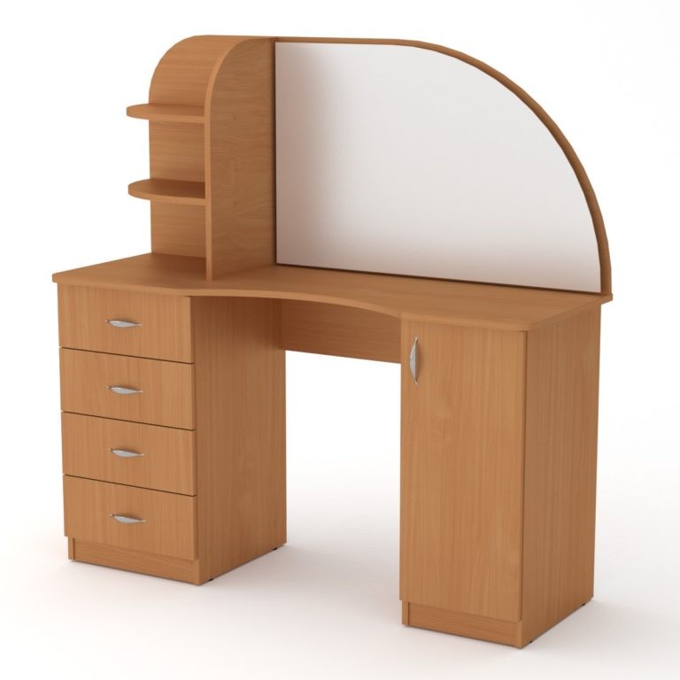Трюмо-6Четыре выдвижных ящика, вместительная тумбочка и три открытых полки - это Трюмо-6 от «Компанит». Особенность модели - красивое зеркало закруглённой формы, которая перекликается с геометрией полок. Простая конструкция, качественная фурнитура и сдержанный стиль. Материал - ламинированная ДСП, которая производится по современным технологиям и абсолютно безопасна для здоровья. Благодаря широкой палитре оттенков, к трюмо довольно просто подобрать мебель в комплект, к тому же оно подойдет практически под любой интерьер. Габаритные размеры: Ширина: 1300 мм. Высота: 1300 мм. Глубина: 460 мм. Материал: ламинированное ДСП. Цвет ДСП: Бук, Венге, Ольха, Орех Экко, Яблоня, Дуб Сонома, Нимфея Альба. Мебель доставляется в разобранном виде в плоских картонных упаковках, упакованная фабрикой производителем. В комплектацию входит фурнитура, крепёж, инструкция по сборке.
