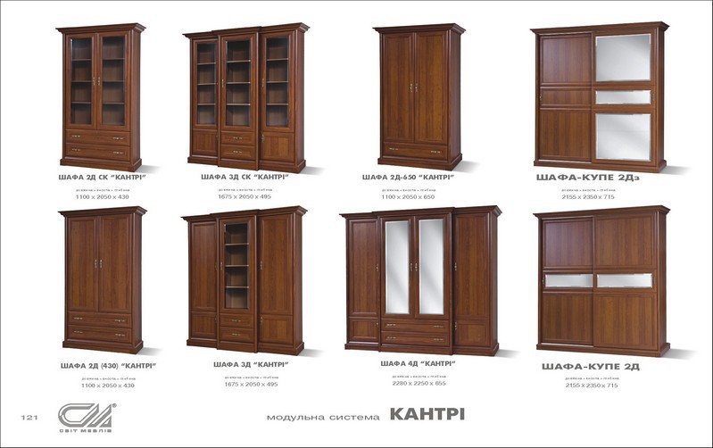 Модульная система Кантри 4Коллекция мебели Кантри фабрики Світ Меблів призведена в классическом стиле. Каждая деталь мебели Кантри продумана до мелочей и насыщена настроением давних эпох. Карнизы и цоколи в модулях резные. Утонченная фурнитура ярко дополняет общий вид мебели Кантри. Благодаря разнообразию модулей в системе Кантри возможно обставить Ваш дом в изысканном, богатом, классическом стиле. Цвет каштан, в котором изготовлена мебель Кантри добавляет в общий вид интерьера теплоту и уют. Разнообразие полок, ящичков, шкафчиков и витрин позволит Вам с легкостью хранить большое количество вещей, посуды и др.Корпус – ДСП ламинир.; Рамочный фасад – МДФ. В витринах дверки изготовлены из каленого прозрачного стекла. Корпус и фасад – каштан. Шкаф 4Д 2280х2250х655, Пенал/Пенал Ск 705х2050х430, Буфет угловой 605х905х605, Витрина угловая 585х1150х585, Тумба 565х525х385, ТВ тумба 1010х550х545, Тумба мобильная 515х760х680, Стол письменный 1580х770х680, Комод-60 615х905-455, Комод-100 1010х905х455 Материал: Корпус: