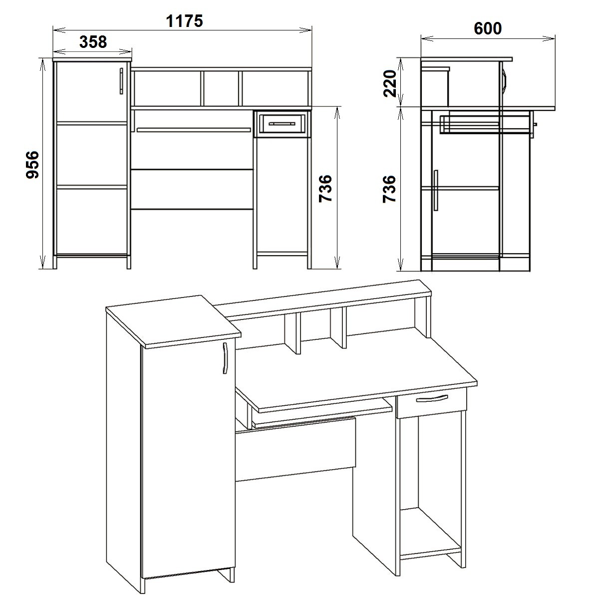 Габаритные размеры: Ширина: 1175 мм. Высота: 736 + 220 мм, Глубина: 600 мм. Материал: ламинированное ДСП. Цвет ДСП: Бук, Венге, Ольха, Орех Экко, Яблоня, Дуб Сонома, Нимфея Альба. Мебель доставляется в разобранном виде в плоских картонных упаковках, упакованная фабрикой производителем. В комплектацию входит фурнитура, крепёж, инструкция по сборке.