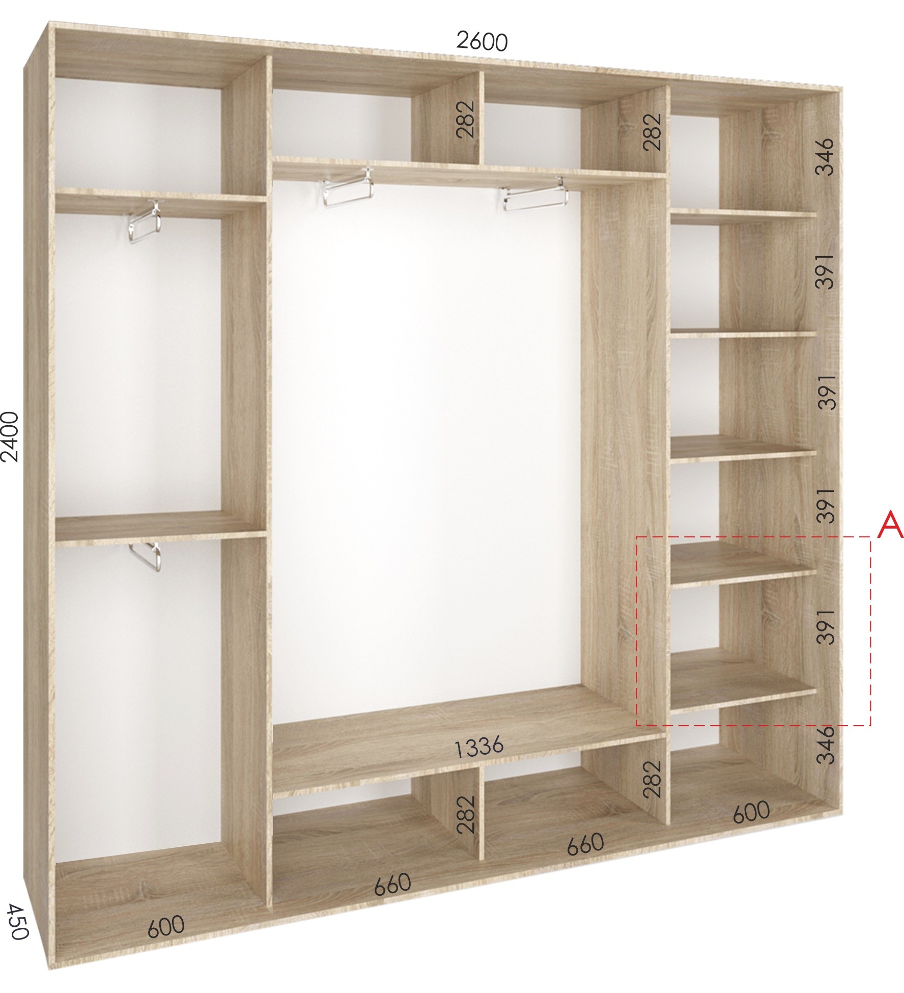 2600ммх2400ммПри стандартном наполнении шкафа-купе, вы можете подобрать понравившиеся вам фасады , они могут быть как классическими зеркальными, так и с полно-цветной фото-молекулярной печатью рисунка или фотографии . Технология пескоструйной обработки зеркала дает возможность нанести понравившийся рисунок или орнамент по всей поверхности зеркальных дверей шкафа . Фабричное изготовление всех компонентов, предлагаемых шкафов-купе, гарантирует более высокое качество при невысокой цене по сравнению со шкафами-купе изготовленными на заказ кустарным методом. Фирма "Феникс", с которой сотрудничает наш интернет магазин мебели "Купи-Тут", легко выполнит любые оригинальные заказы клиентов из Тирасполя и всего Приднестровья . Шкаф-купе под общей раздвижной системой может быть шириной до 5-ти метров, а высота до Используемые комплектующие : Раздвижная система Deco Цвета профиля: Серебро, Золото, Венге, Олива