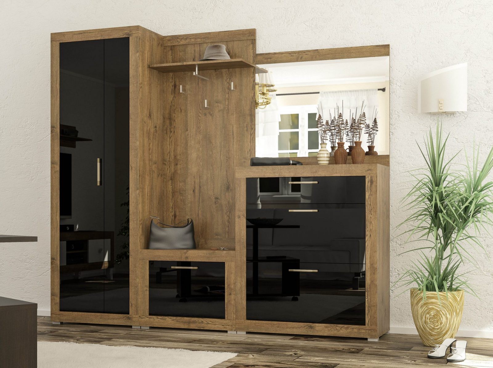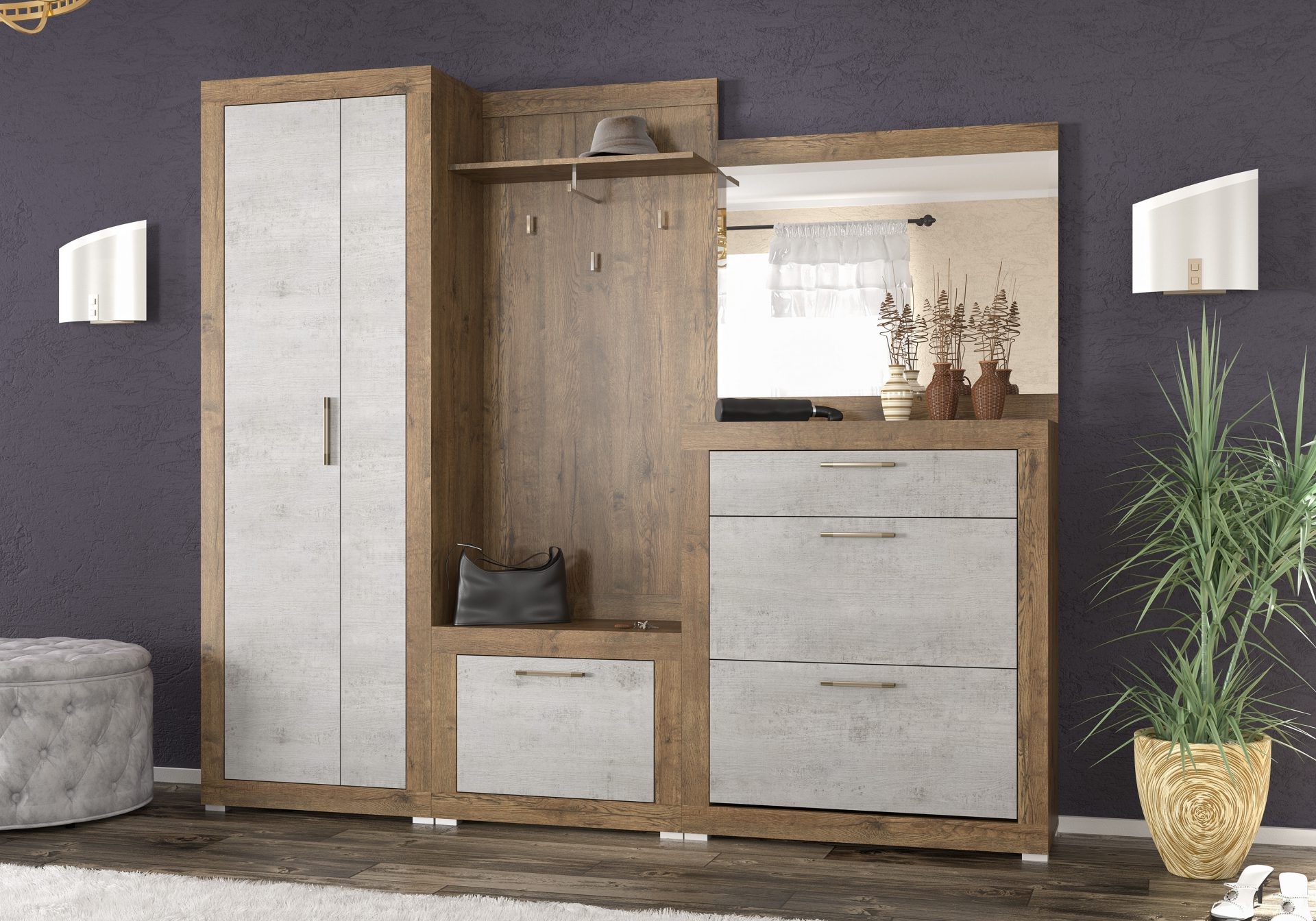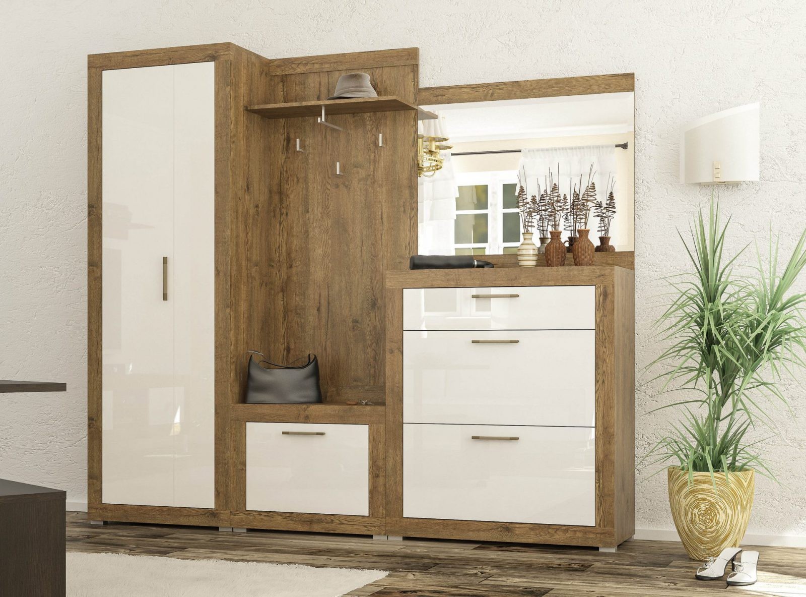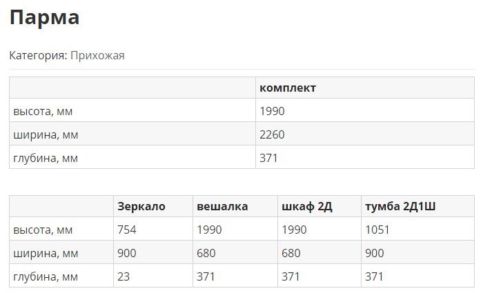 Прихожая ПармаПрихожая Парма - яркий и эффектный образец современной мебели в прихожую. Во-первых, здесь использованы модные небанальные цвета. Корпус элементов прихожей изготавливается из ДСП цвета дуб април- это текстурный коричневый цвет. А вот фасады изготавливаются из глянцевого МДФ белого или черного цвета. Данный набор состоит из четырех элементов, которые можно покупать как комплектом, так и по отдельности. Что же касается составляющих, то в состав входит двухдверный шкаф (он имеет по одной полке сверху и снизу, а также тремпель для плечиков), вешалка с тумбой и полкой для шапок, зеркало, а также тумба для обуви. Последняя имеет выдвижной ящик и два отдела для обуви, где есть механизм гамбургер, обеспечивающий компактное размещение. Цена указана за комплект на первом фото