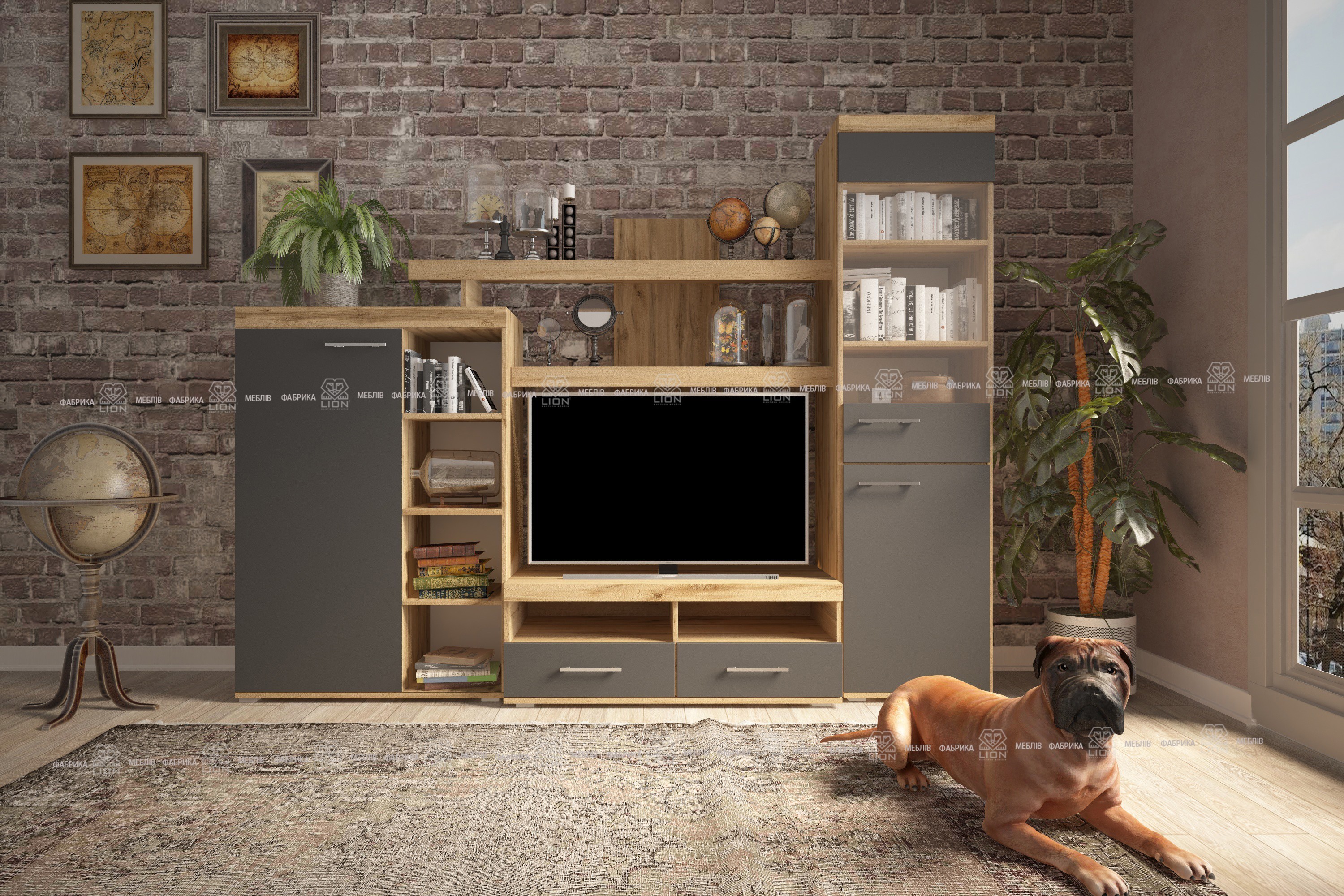 Стенка включает в себя место под телевизор, два выдвижных ящика, две свободные ниши и два однодворных отделения с семью открытыми полками и 2 большими ящиками.