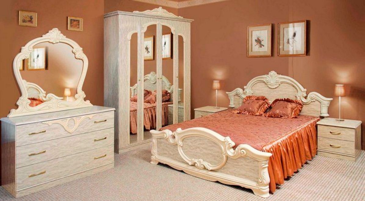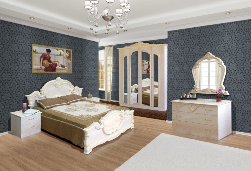 Корпус изготовлен из ДСП, фасад - МДФ. Мебельный комплект для спальни Империя не оставит равнодушным ни одного ценителя роскоши и комфорта. Созданная в классическом дизайне, спальня Империя сделает Ваш отдых особенно приятным.