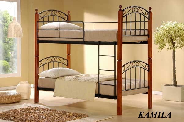 КамилаКровать двухъярусная на металлической основе. Ножки данной модели выполнены из массива натурального дерева, боковые части включают элементы ковки, лестница металлическая. Каркас спального места выполнен из металлической квадратной трубы, окрашенной черной порошковой краской, и оборудован буковыми ламелями. Страна производитель: Малайзия