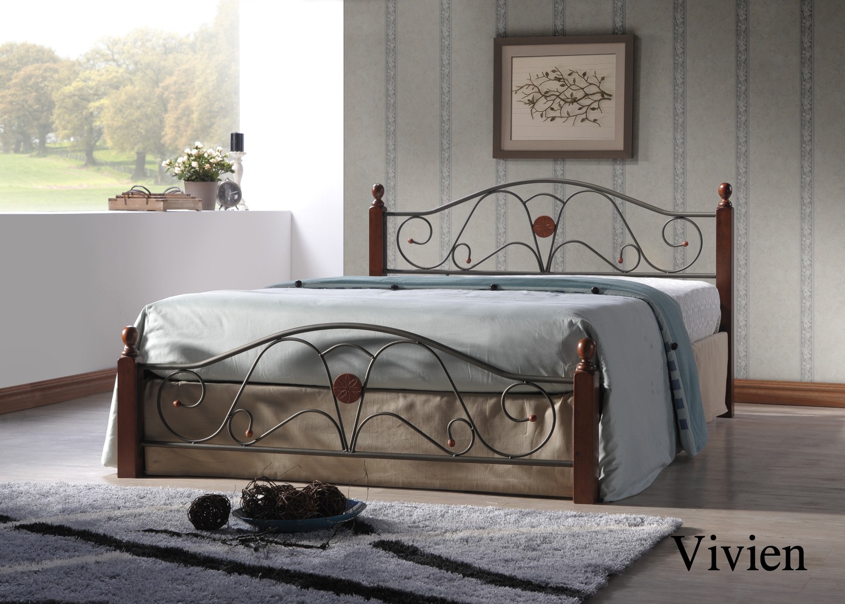 ВивьенМатериал: метал + дерево. Цвет: дерево - орех+металл - античное золото Кровать двуспальная на металлической основе. Ножки данной модели выполнены из массива натурального дерева, боковые части включают элементы ковки. Каркас спального места выполнен из металлической квадратной трубы, окрашенной черной порошковой краской, и оборудован буковыми ламелями. Габаритные размеры кровати 160х200см : ширина 170 см, длина 210 см, высота 120 см. Производитель: Малайзия.цена Спал. место: 140*200- 114 у.е Цена указана за кровать Вивьен 1400*2000мм