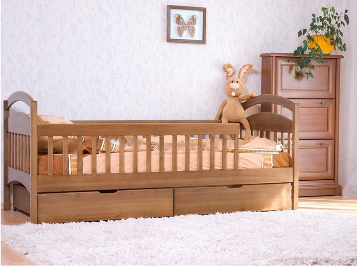 Кровать-трансформер может превратиться из двухярусной в две полноценные одинарные кровати: одна - для деток ясельного и младшего школьного возраста, вторая- для подростков и деток старшего возраста. Для покрытия изделий используются лаки и краски, которые удовлетворяют медицинским и экологическим нормам и являются сертифицированными. При проектировании модели первоочередной целью всегда является безопасность ребенка, удобство в пользовании, внешний привлекательный вид и оригинальный дизайн кроваток. В комплектацию входят ламели (каркасы под матрасы). Модели кроватей укомплектовываются, ящиками для игрушек и белья, ортопедическими матрасами. Кровать представлена в цветах: темный орех, груша, светлый орех, яблоня, ольха, бук, ваниль, белый, венге. Материал: ёлка, ольха Кровать двухъярусная 80х190х170 см. Возможны восемь варианта комплектации кровати: