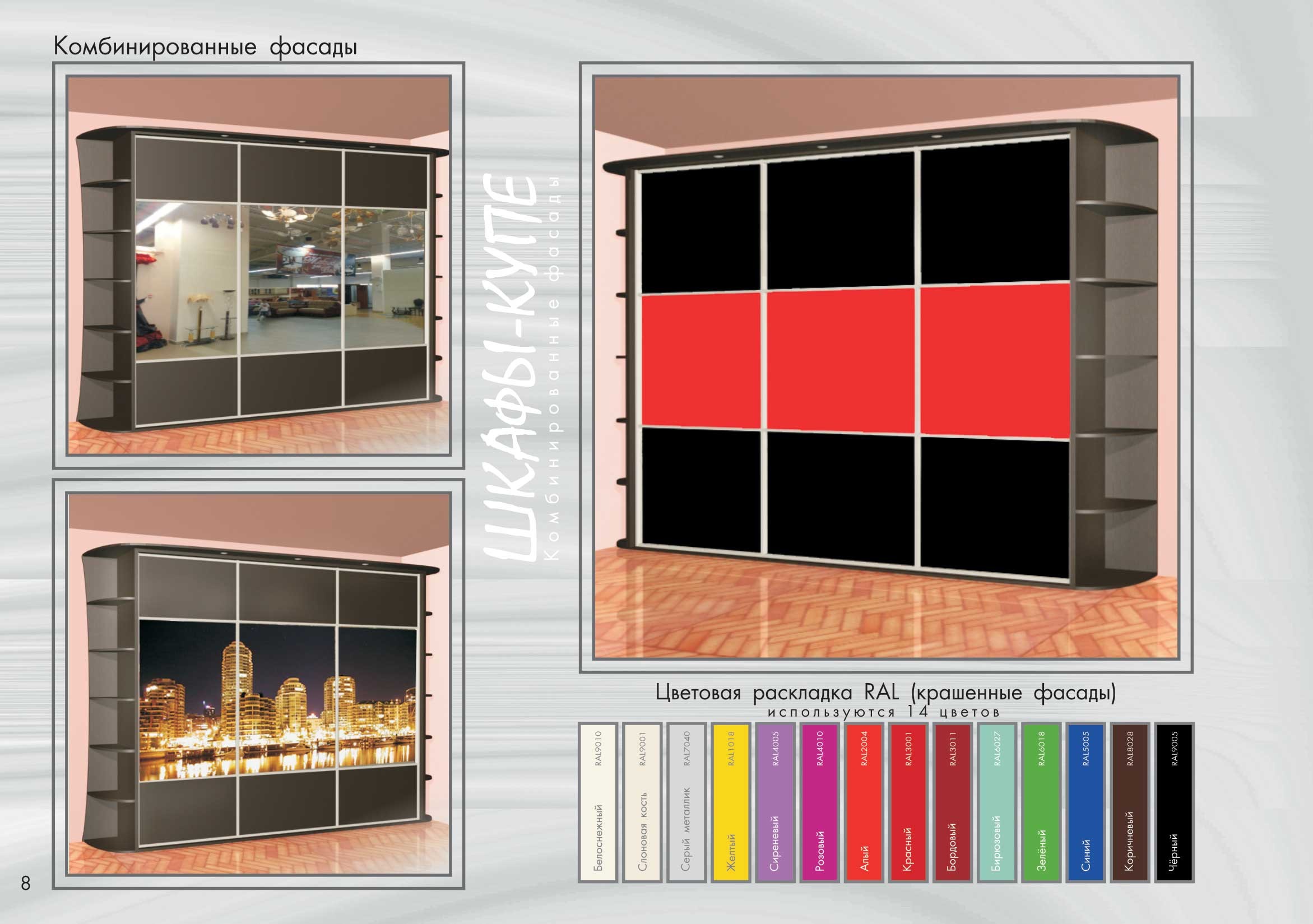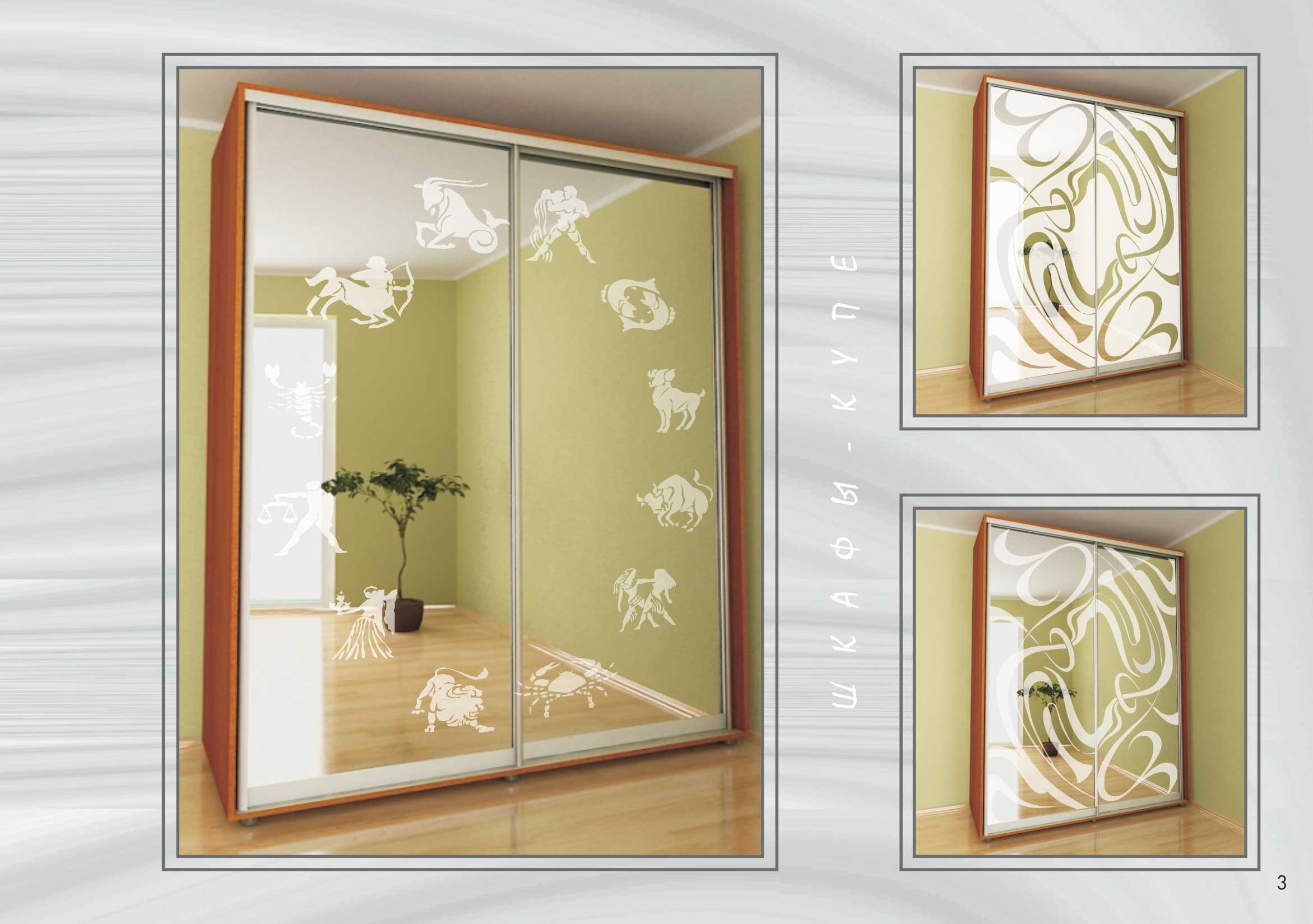 При стандартном наполнении шкафа-купе, вы можете подобрать понравившиеся вам фасады , они могут быть как классическими зеркальными, так и с полно-цветной фото-молекулярной печатью рисунка или фотографии . Технология пескоструйной обработки зеркала дает возможность нанести понравившийся рисунок или орнамент по всей поверхности зеркальных дверей шкафа .