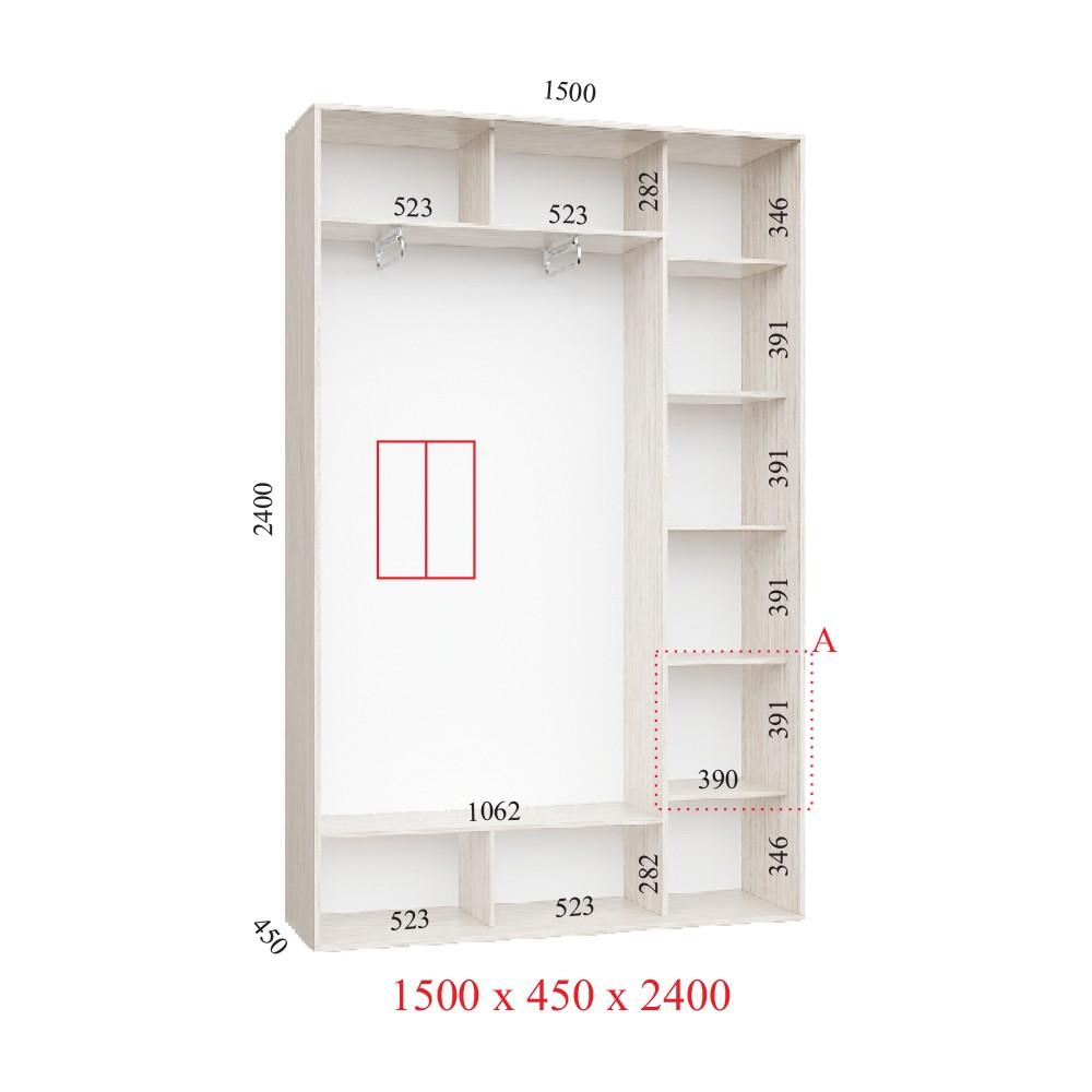 Добрый день, нужен шкаф 1500х2400 глубина 600мм, но внутри добырь еще один ряд полок по 40 см за счет отделения для вешалок, такое возможно и сколько будет он стоить?