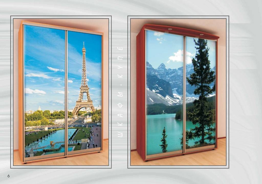 При стандартном наполнении шкафа-купе, вы можете подобрать понравившиеся вам фасады , они могут быть как классическими зеркальными, так и с полно-цветной фото-молекулярной печатью рисунка или фотографии . Технология пескоструйной обработки зеркала дает возможность нанести понравившийся рисунок или орнамент по всей поверхности зеркальных дверей шкафа .