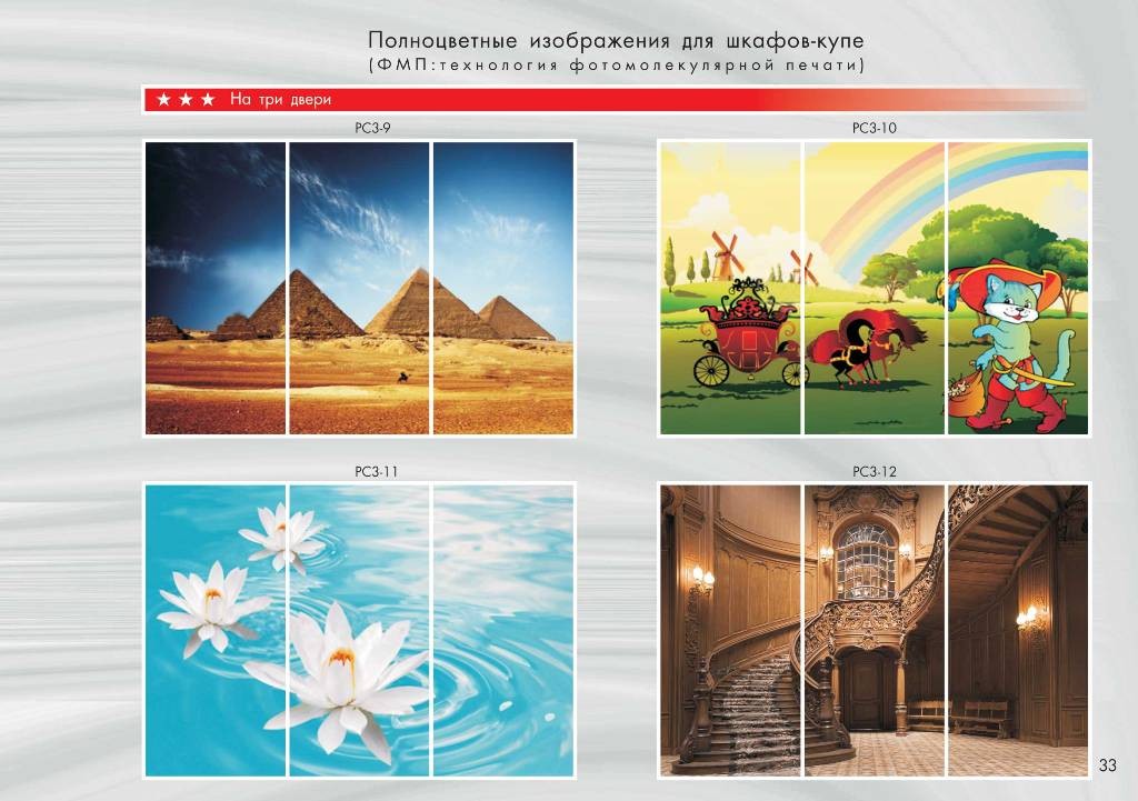 При стандартном наполнении шкафа-купе, вы можете подобрать понравившиеся вам фасады , они могут быть как классическими зеркальными, так и с полно-цветной фото-молекулярной печатью рисунка или фотографии . Технология пескоструйной обработки зеркала дает возможность нанести понравившийся рисунок или орнамент по всей поверхности зеркальных дверей шкафа .