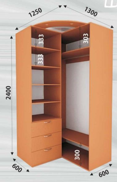 _90° угловой шкаф купе 2400ммПри стандартном наполнении шкафа-купе, вы можете подобрать понравившиеся вам фасады , они могут быть как классическими зеркальными, так и с полно-цветной фото-молекулярной печатью рисунка или фотографии . Технология пескоструйной обработки зеркала дает возможность нанести понравившийся рисунок или орнамент по всей поверхности зеркальных дверей шкафа . Фабричное изготовление всех компонентов, предлагаемых шкафов-купе, гарантирует более высокое качество при невысокой цене по сравнению со шкафами-купе изготовленными на заказ кустарным методом. Фирма "Феникс", с которой сотрудничает наш интернет магазин мебели "Купи-Тут", легко выполнит любые оригинальные заказы клиентов из Тирасполя и всего Приднестровья . Шкаф-купе под общей раздвижной системой может быть шириной до 5-ти метров, а высота до 2,7 метра . Используемые комплектующие : Раздвижная система Deco Цвета профиля: Серебро, Золото, Венге, Олива ![]() Материал ДСП фирмы KRONO ![]() Цена указана за угловой шкаф-купе : высота: 2400мм ширина: 1250мм х1300мм глубина: 600мм в комплекте с одним зеркальным фасадом Цену на шкаф-купе нужного вам размера уточните по телефону или email