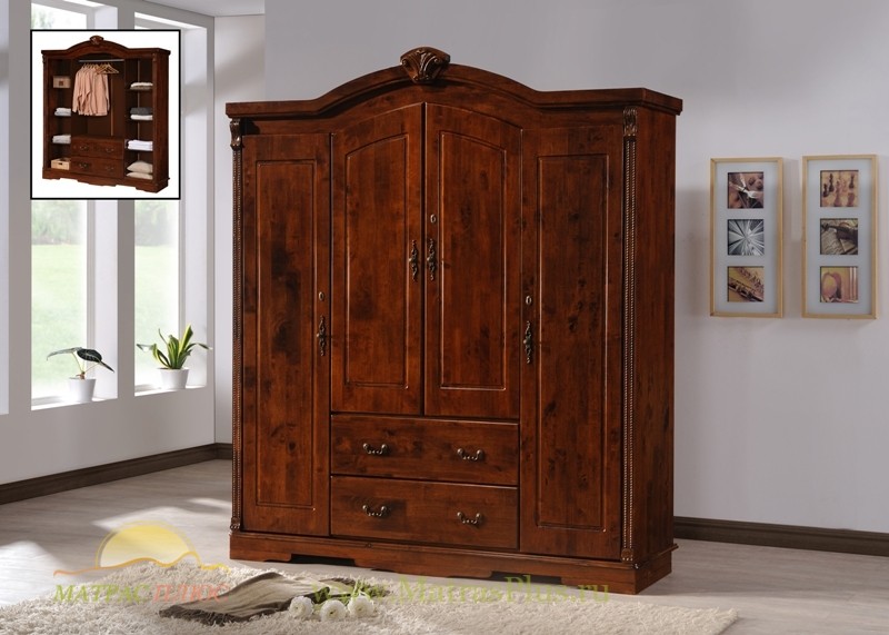 Шкаф 4ДШкаф 4-х дверный с двумя ящиками, выполнен из массива гевеи, тонированного в цвет Тёмный орех. Производство: Малайзия. Цвет дерева: Тёмный орех; Размеры (ДхГхВ): 132 х 50 х 215 см.
