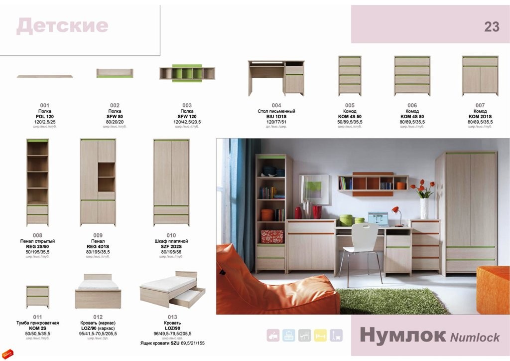 Мебель Гербор НУМЛОК – практичная коллекция украинской фабрики Gerbor для оформления детской и молодежной комнаты. Изготавливается в цвете «дуб светлый беллуно». Привлекает внимание яркими двусторонними (оранжевый/зеленый) вставками, которые легко переставляются в зависимости от предпочтений. Особенно эффектно выглядит детская Numlock Gerbor при комбинации цветов. Кровать, которую можно доукомплектовать выдвижным ящиком, письменный стол, функциональные пеналы и вместительные комоды дают возможность меблировать комнату как для учебы, так и для отдыха. Применяемая современная система Push up позволяет открывать двери и ящики легким нажатием. Мебель Нумлок Гербор – отличное решение для создания неповторимой яркой детской комнаты.