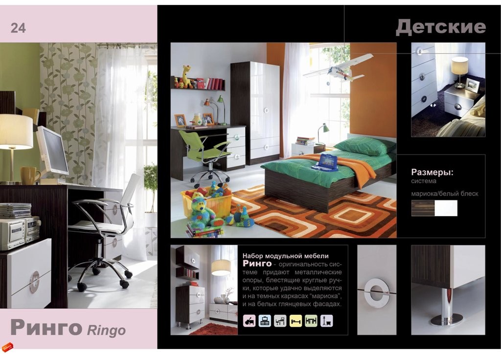 Изготавливается из ДСП в цвете «мориока» с белоснежными глянцевыми фасадами. Блестящие круглые ручки и высокие ножки с серебристым блеском являются отличительной чертой мебели Ринго BRW. Наличие разных модулей, которые можно легко комбинировать по собственному усмотрению, позволяет создавать уникальные комплекты для детских комнат, спален, гостиных и кабинетов.
