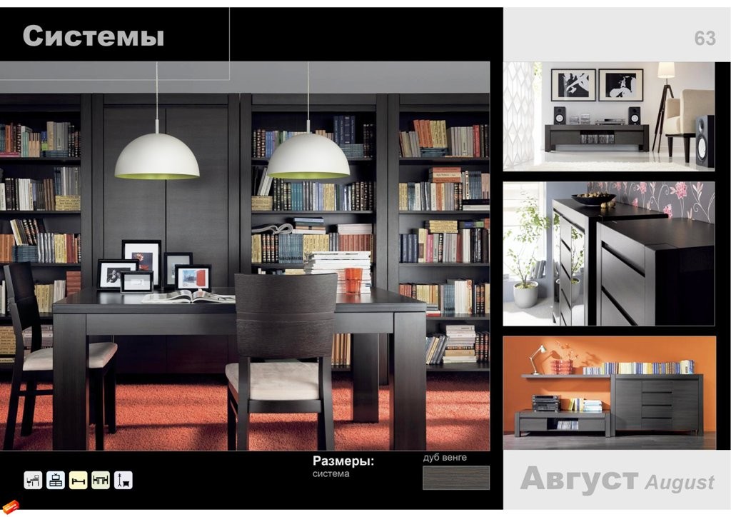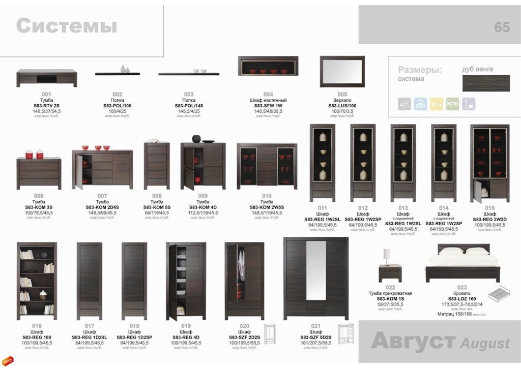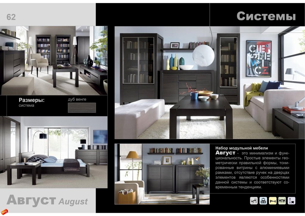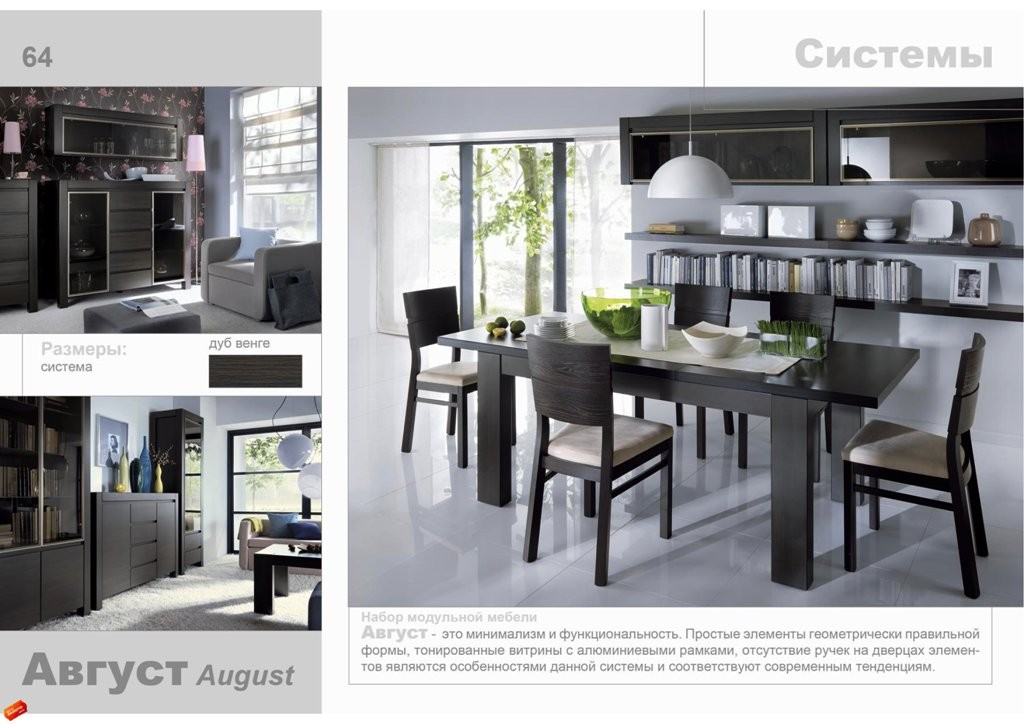 БРВ мебель AUGUST выполнена в двух цветовых вариантах: дуб венге и дуб сонома. Алюминиевые рамки в витринах поддерживают стиль хай-тек, а тонированное стекло придает теплоту интерьеру. Отсутствие ручек – новое и интересное дизайнерское решение. В состав набора модульной мебели AUGUST входят простые элементы геометрически правильной формы. Коллекция носит массивный, монолитный характер, но при этом сохраняется легкость конструкций. Функциональность, наличие тонированных витрин и отсутствие ручек на дверцах элементов являются особенностями данной коллекции и подчеркивают модные тенденции нынешнего сезона. Набор выполнен в стиле минимализма.