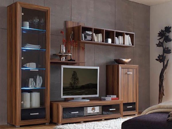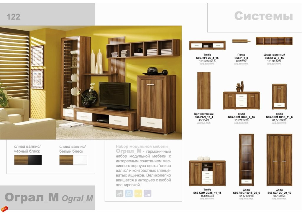 Изготавливается из ДСП с накладками МДФ. Характеризуется интересным сочетанием массивного корпуса цвета слива валлис и контрастных глянцевых фасадов. Отсутствие лишних деталей позволяет компактно расставить модули коллекции в соответствии с вашим вкусом. Стенки Ogral M БРВ предназначены для любителей минималистического стиля.