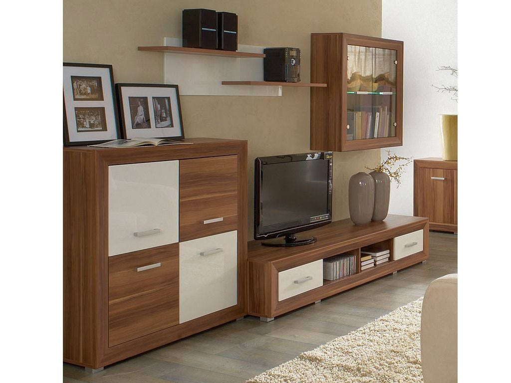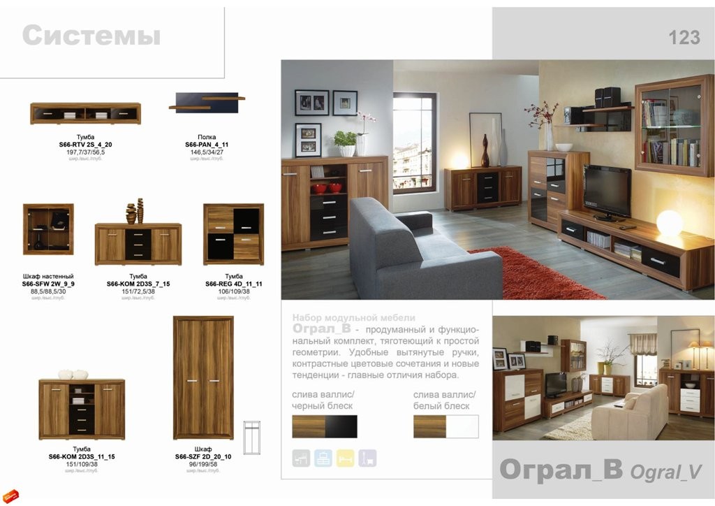 Изготавливается из ДСП с накладками МДФ. Привлекает внимание контрастными глянцевыми фасадами. Отсутствие лишних деталей позволяет компактно расставить модули коллекции в соответствии с вашим вкусом. Стенки Ogral V БРВ станут украшением вашей гостиной.