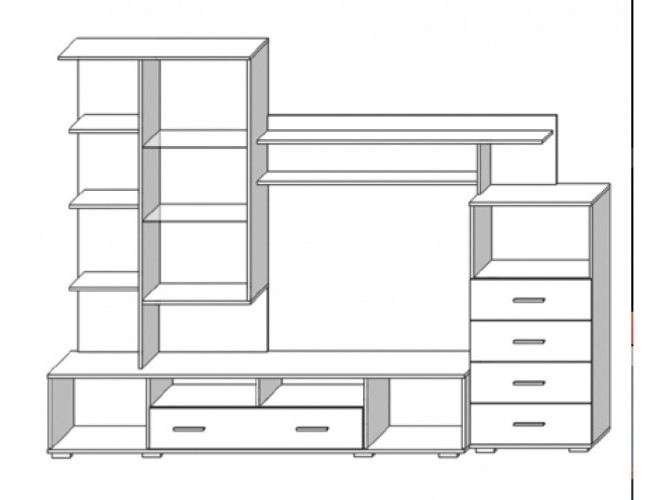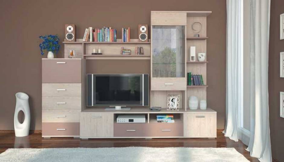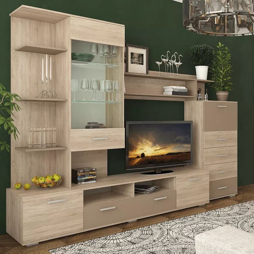Гостиная Рио RioРазмеры стенки Рио Сокме: Ширина - 2650 мм. Высота - 1950 мм. Глубина - 465 мм. Размер ниши для ТВ: Стенка Рио - это современная стенка которая гармонично впишется в любой интерьер гостиной. Оптимальное расположение витрин, тумбы пенала и комбинированные оттенки делают ее функциональной и элегантной. Цвет мебели: корпус - дуб сонома, фасад - дуб сонома, мокка.