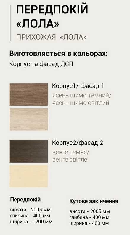 Лола: Гамма фасадов прихожей Лола: представлена в таких цветах: корпус-темный венге, фасад-темный светлый венге. Размеры: Ширина: 1600 мм Дополнительно можно приобрести угловое окончание .