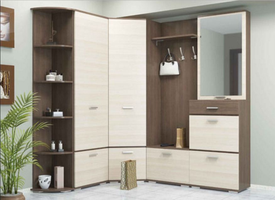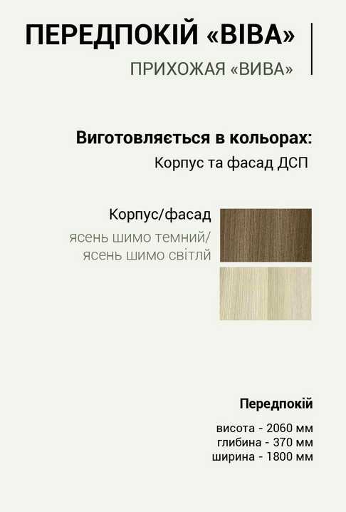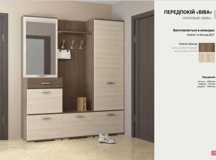 Вива: корпус ДСП, фасад ДСП. Гамма фасадов прихожей Вива: представлена в таких цветах: корпус-ясень шимо темный фасад-яшень шимо светлый При оформлении заказа прихожей Вива в нашем интернет-магазине, Вы можете выбрать и добавить или убрать другие элементы из модульной прихожей Вива. Цена указана за набор фото 1.(Тумба+зеркало,угловой шкаф,стеллаж угловой.) Цену на отдельные элементы уточните по телефону или email