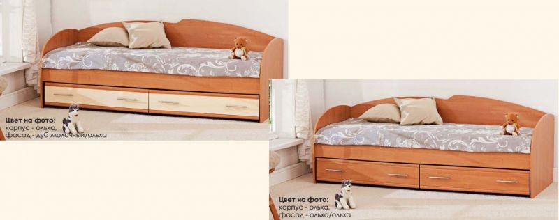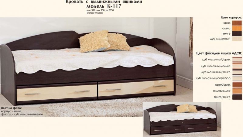 Размеры: Цвет корпуса кровати К-117 Комфорт по Вашему выбору: дуб молочный, ольха, орех, венге. Цвет фасадов ящика ЛДСП: Цена указана за кровать К-117 без матраца, с подставкой под матрац ДВП