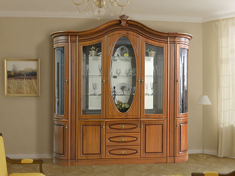 Сервант Цезарь 3 Caesar 3производится фабрикой Світ Меблів, Украина. Габариты гостиной Цезарь: Ширина: 246 см; Высота: 242 см; Глубина: 50 см. Корпус - ламинированная ДСП. Фасад - МДФ. : Корпус и фасад - орех, орех патина;