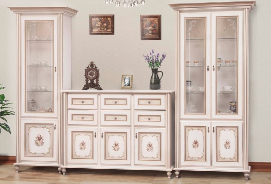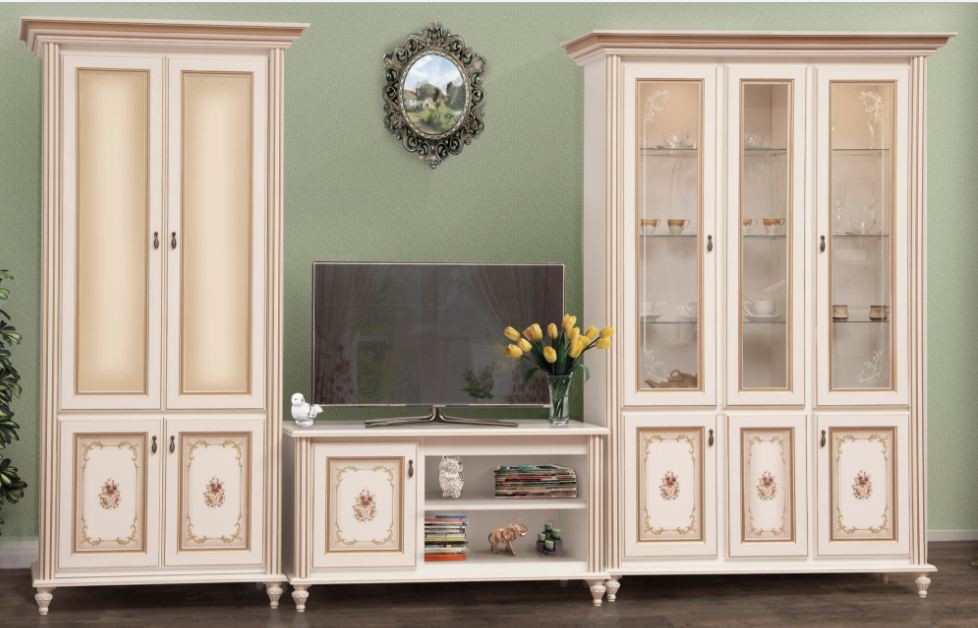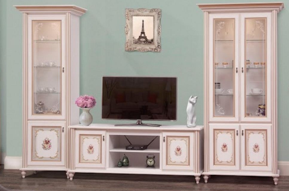 Корпус – ДСП ламинир.; Фасад – МДФ. В витринах стекло каленое, прозрачное с художественной обработкой.. Корпус и фасад – прованс белый с золотистой патиной и декоративным принтом. Ручки (фурнитура) – цвет латунь. Цена указана за набор мебели фото 1 : ( Витрина 1Д,Комод ТВ 1,5м, Витрина 2Д) . Цены на отдельные элементы уточните по телефону или email/