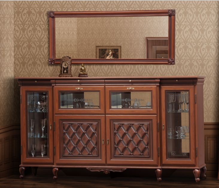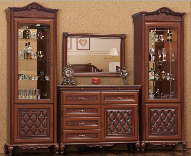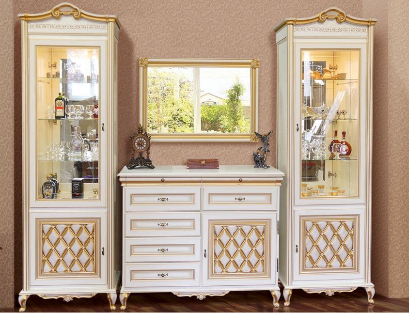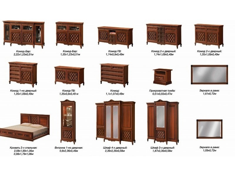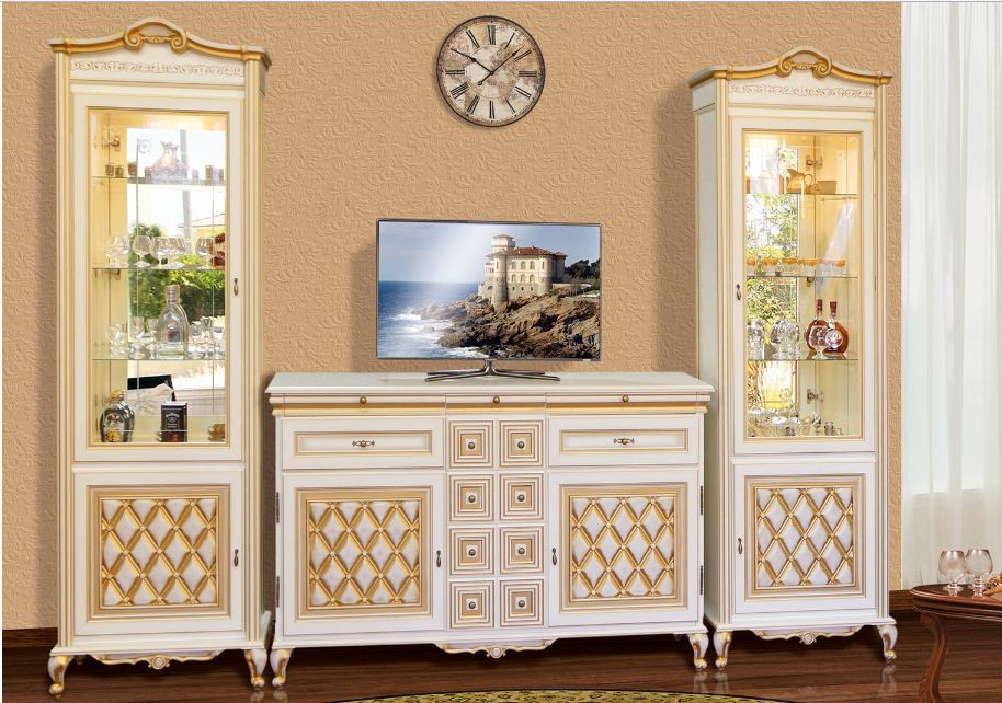 Гостиная Ливорно, состоит из элементов модульной системы Ливорно. Модульная система Ливорно, производство фабрики Світ Меблі, Украина.Мебель Ливорно изготовляется из материалов: Корпус – ДСП ламинир.; Фасад – МДФ. Производится в цвете: Корпус и фасад – прованс светлый; Корпус и фасад – прованс темный. Ручки (фурнитура) – цвет латунь. В витринах стекло из каленого прозрачного стекла с художественной обработкой. Мебель Ливорно - это классические формы, благородные оттенки и роскошный декор в сочетании с высоким качеством, практичностью и функциональностью. | Бар (2.2) | . . . . . . . . | 2215*1225*510 | | Зеркало (1,6) | . . . . . . . . | 1610*720*55 | | Комод 2Д (1.7) | . . . . . . . . | 1740*1085*490 | | Комод 2Д (1,3) | . . . . . . . . | 1350*1085*490 | | Кровать 2сп (1,6) | . . . . . . . . | 1796*1060*2095 | | Комод ТВ (1.3) | . . . . . . . . | 1350*895*490 | | Кровать 1сп | . . . . . . . . | 996*1060*2095 | | Витрина 1Д | . . . . . . . . | 788*2358*443 | | Тумбочка | . . . . . . . . | 550*525*440 | | Шкаф 4Д | . . . . . . . . | 2377*2358*565 | | Зеркало (1,1) | . . . . . . . . | 1090*720*55 | | Шкаф 3Д | . . . . . . . . | 1852*2358*565 | | Кровать 2сп (1,8) | . . . . . . . . | 1996*1060*2095 | | Комод ТВ (1.7) | . . . . . . . . | 1740*895*490 | | Комод 1Д | . . . . . . . . | 1350*1085*490 | | Бар (1.3) | . . . . . . . | 1350*1225*485 |