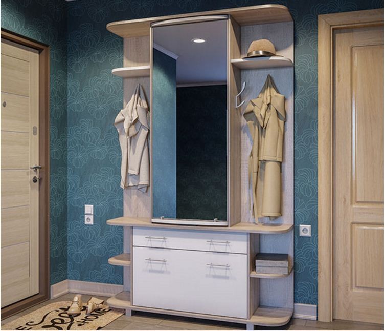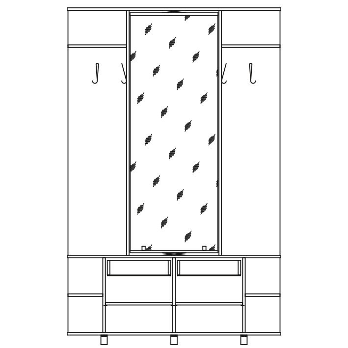 Прихожая Прима - мебель необычной конструкции. Зеркало в центральной части установлено на вращающейся панели, за которой можно разместить одежду на тремпелях. Под зеркалом два выдвижных ящика за общим фасадом, под ними четыре полки за откидной дверцей.