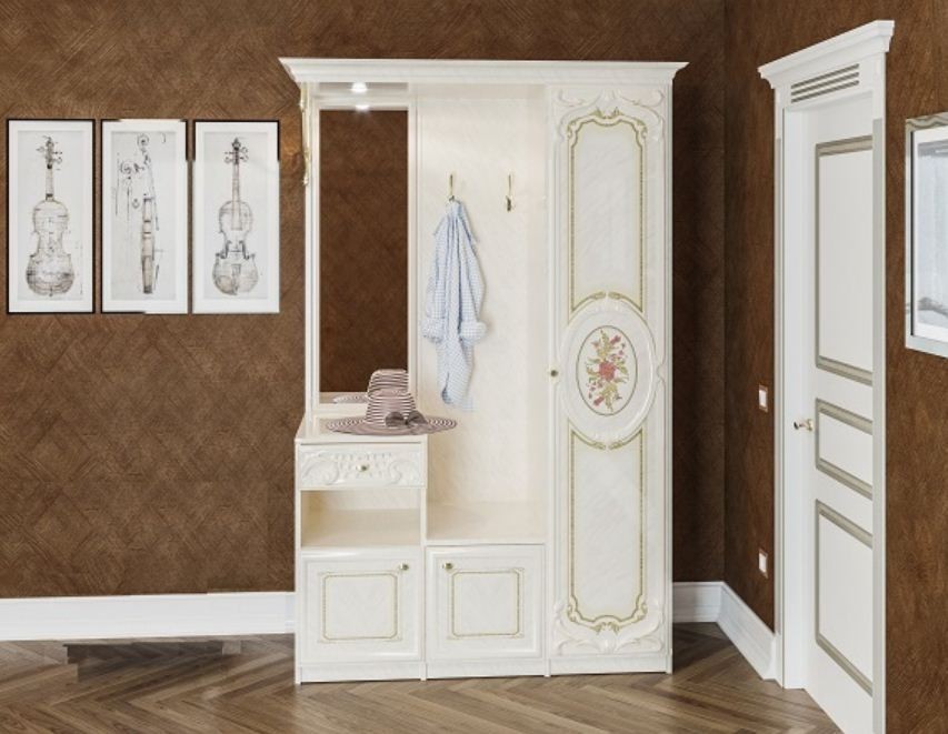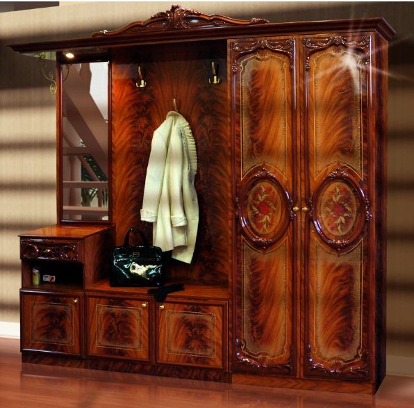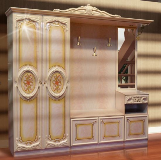 Прихожая Бристоль Новая Bristolпроизводится фабрикой Світ Меблів, Украина. Состоит из двухдверного платяного шкафа, двухдверной тумбы для обуви, однодверной тумбы с нишей и выдвижным ящиком, панели с тремя крючками для одежды и зеркала прямоугольной формы. Завершает композицию фигурный резной карниз. Прихожая Бристоль Новая характеризуется роскошным классическим дизайном, утонченными золотистыми ручками, декоративными фасадами с изящной резьбой и красивым орнаментом. - ДСП. : корпус и фасад - орех глянец; корпус и фасад - роза глянец. Габариты: