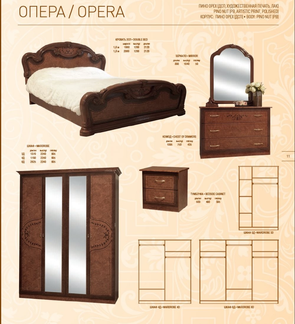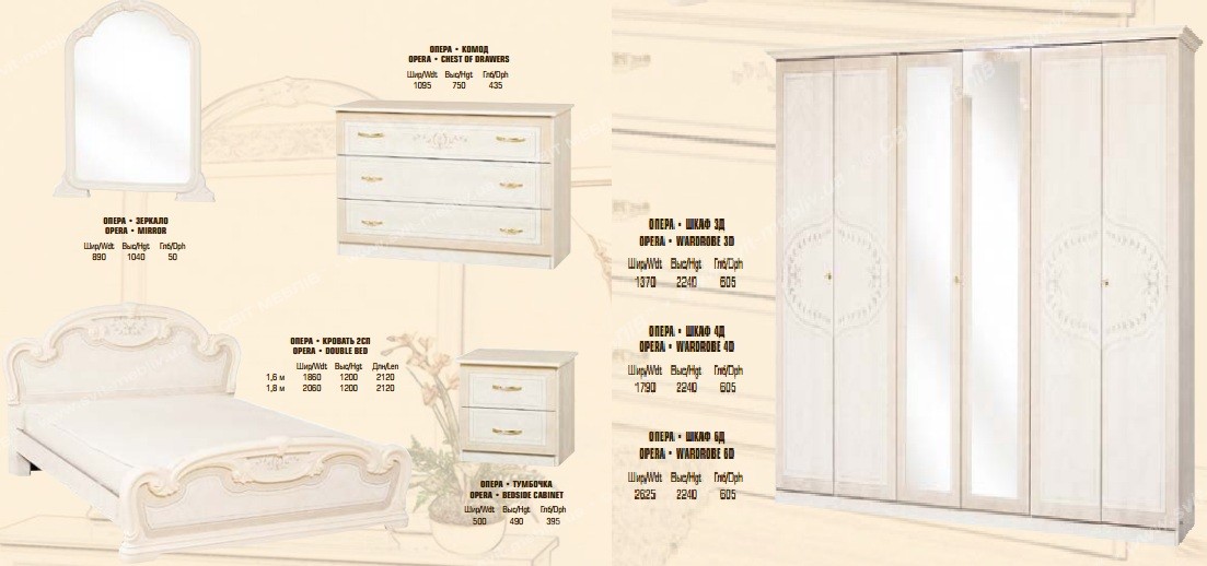 При оформлении заказа Спальни Опера, Вы можете убрать или добавить другие элементы из модульной спальни Опера. Цена указана : За спальню со шкафом 4Д (без матраца и подставки). Цены на отдельные элементы уточните по телефону или е-mail.