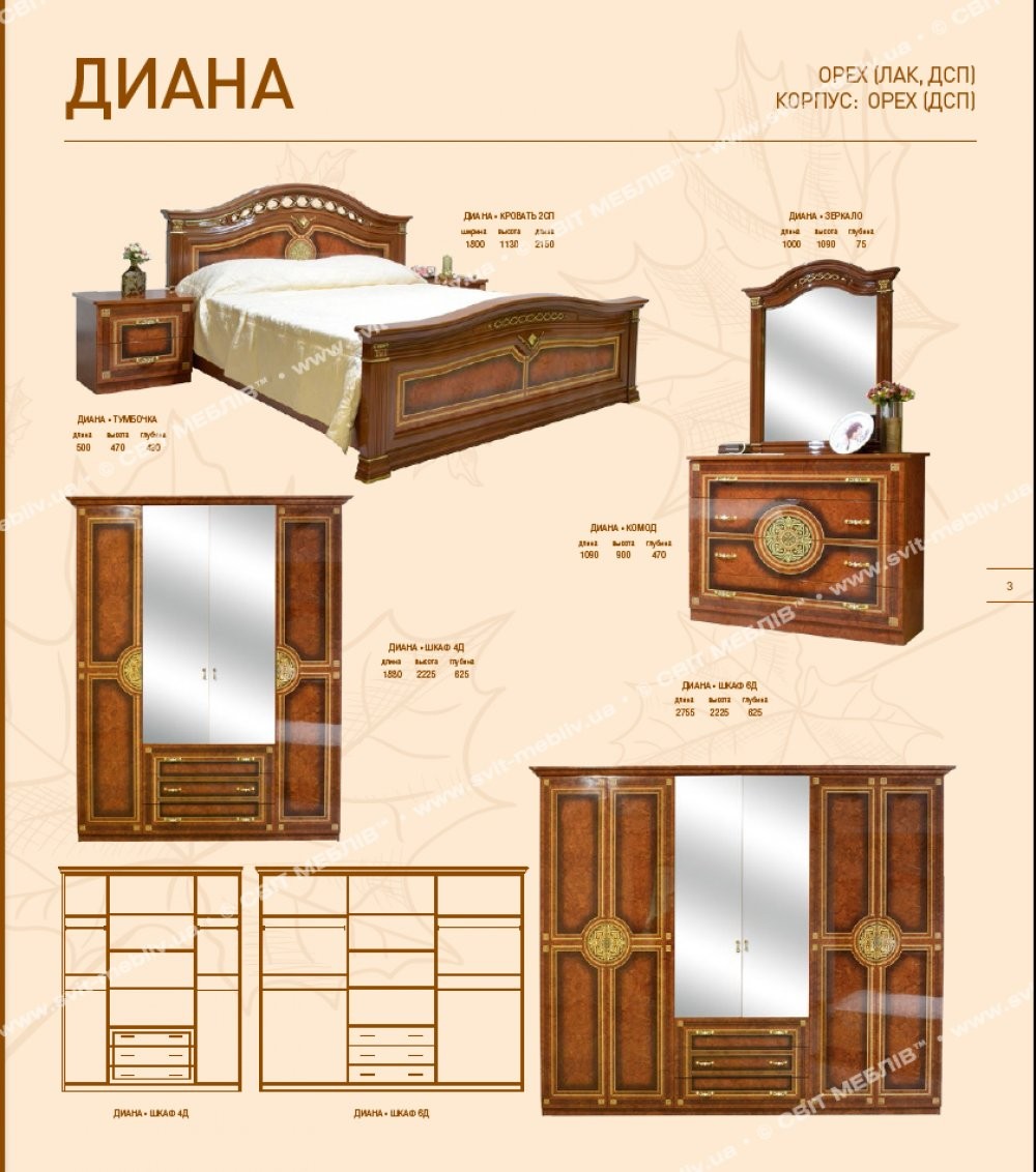 Спальня Диана DianaКорпус – ДСП; Фасад – ДСП лак с художественной печатью. корпус - орех, фасад - орех глянец. Комод. . . . . . . .1090*900*470 Шкаф 6Д. . . . . . . .2755*2225*625 Кровать 2сп (1,6м). . . . . . . .1800*1130*2150 Тумбочка. . . . . . . .500*470*430 Шкаф 4Д. . . . . . . .1880*2225*625 Зеркало. . . . . . . .1000*1090*75 ЦЕНА УКАЗАНА на спальный гарнитур со шкафом 4Д (без матраца, без подставки). Цены на отдельные элементы уточните по телефону или е-mail.