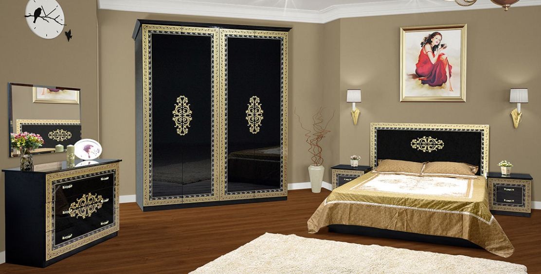 Спальня София SofiaКорпус – ДСП; Фасад – ДСП лак с художественной печатью. корпус - черный, фасад - черный глянец; корпус - белый, фасад - белый глянец