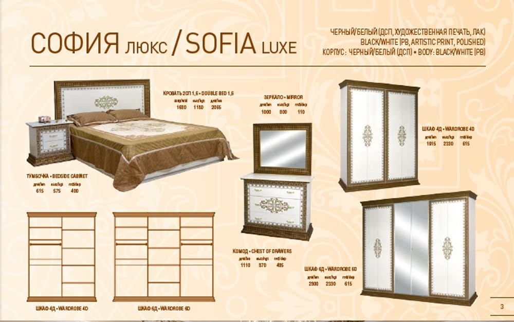 Корпус – ДСП; Фасад – ДСП лак с художественной печатью. корпус - черный, фасад - черный глянец; корпус - белый, фасад - белый глянец Тумбочка. . . . . . . .615*575*400 Шкаф 6Д. . . . . . . .2800*2330*615 Шкаф 4Д. . . . . . . .1915*2330*615 Комод. . . . . . . .1110*870*485 Зеркало. . . . . . . .1000*800*55 Кровать 2сп (1,6м). . . . . . . .1680*1180*2065 При оформлении заказа Спальни София Люкс, Вы можете убрать или добавить другие элементы из модульной спальни София Люкс. ЦЕНА УКАЗАНА на спальный гарнитур со шкафом 4Д (без матраца, без подставки). Цены на отдельные элементы уточните по телефону или е-mail.
