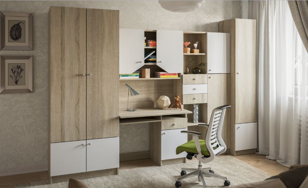 Детская Юниор/белый Yunior, производство фабрики Світ Меблі, Украина. Корпус и фасад сделаны из ДСП, использование этого компонента сохранит значительную функциональность и внешний вид изделия на протяжении многих лет. Сборная модель включает: 1) пенал двухдверный из закрытых полок; 2) шкаф четырехдверный из полок и места для одежды на плечиках; 3) двухдверный книжный шкаф из выдвижных ящиков, открытых и закрытых полок; 4) письменный стол с выдвижной полкой для клавиатуры, небольшой открытой полкой, выдвижным ящиком и шкафчиком; 5) надставка из открытых полок и шкафчиков. Ширина: 300 см; Высота: 205 см; Глубина: 52 см. корпус - дуб сонома, фасад - дуб сонома; корпус - дуб сонома, фасад - белый глянец; корпус - дуб сонома, фасад комбинация цветов - дуб сонома/белый глянец. Корпус и фасад – ДСП.