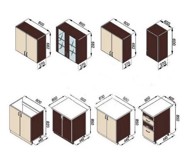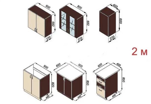 Здравствуйте, Оксана. В двухметровый стандартный комплект входят следующие элементы : низ 80 мойка, низ 80 рабочий стол , низ 40 шухляды, и над этими элементами три верхних тумбы с аналогичными размерами.