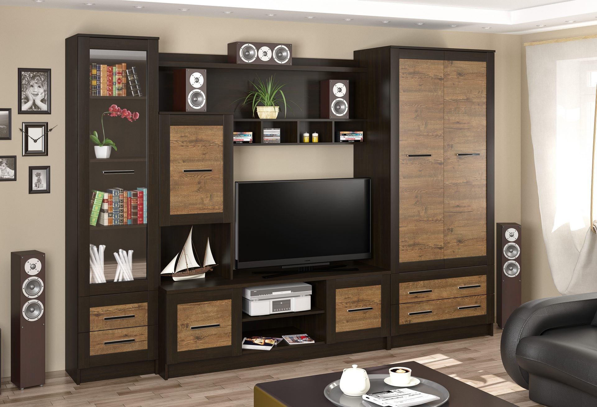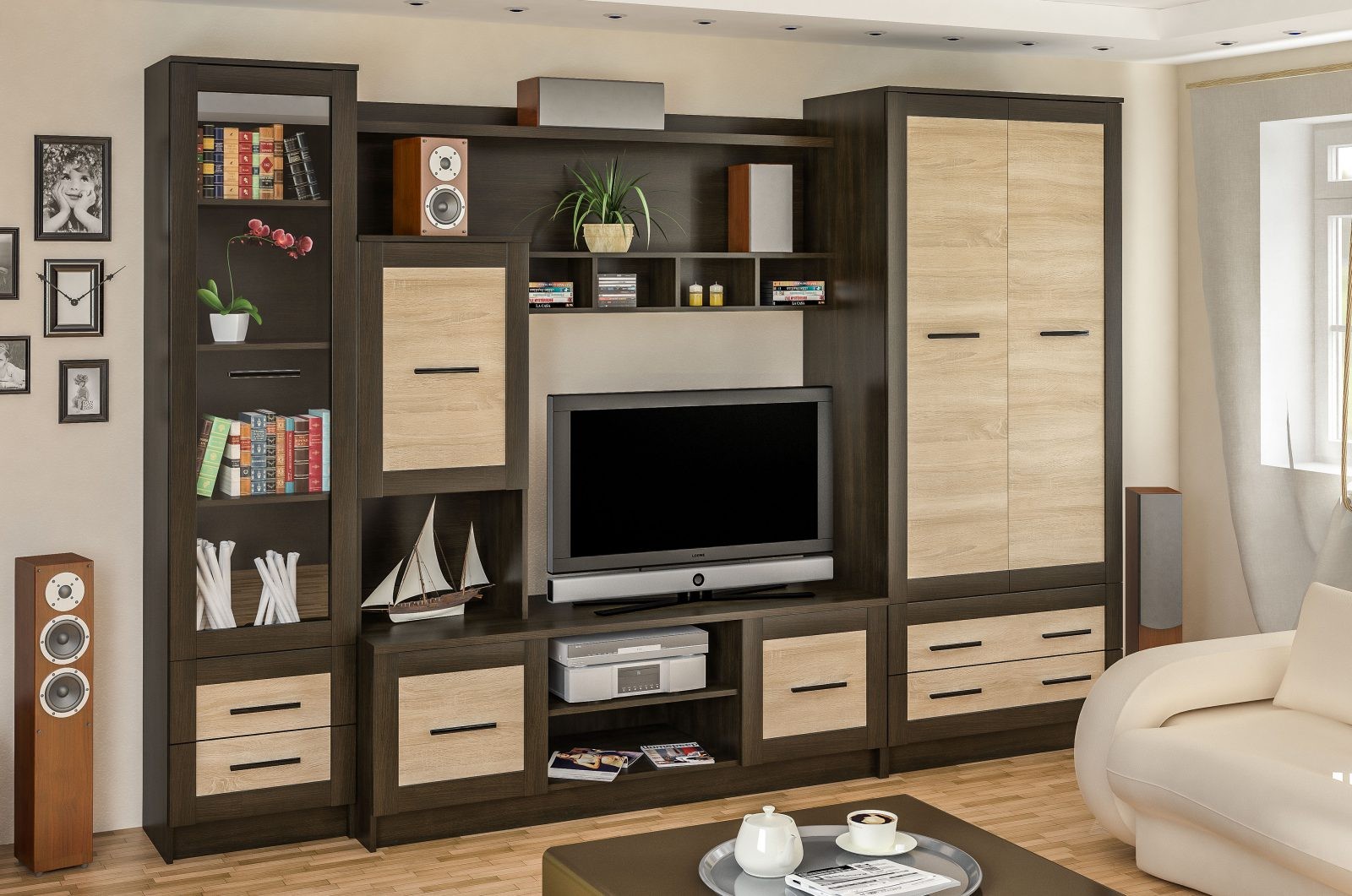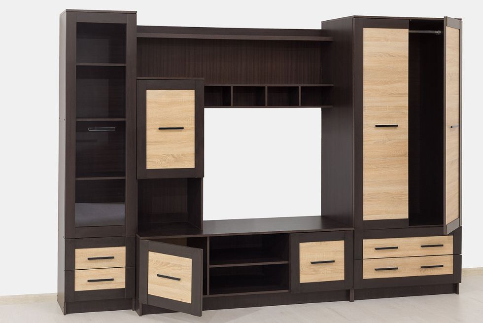 Гостиная КаспийСтенка КАСПИЙ (Мебель Сервис) – изящная коллекция для гостиной комнаты от компании "Мебель-Сервис" представлена в двух вариантах исполнения: окантовка темный венге со вставками двух цветов на выбор – экзотический зебрано или насыщенный дуб самоа. Четкие геометрические формы, прямолинейность и лаконичность. Стильные темные ручки на светлом фоне, множество открытых полок и удобных тумб. Изготавливается в цвете: