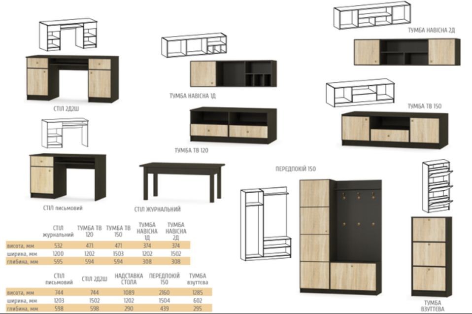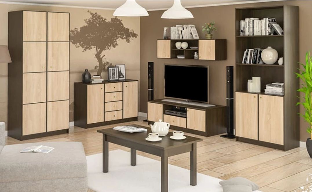 Гостиная ФантазияНаборная мебель для гостиной Фантазия изготовителя Мебель-Сервис - это целый комплекс современной стильной мебели, из элементов которой можно обустроить спальню, гостиную, подростковую комнату , прихожую и даже кабинет. Дизайн мебели Фантазия создан по последним направлениям в оформлении интерьера. Контрастные цвета корпуса и фасадов создают особое настроение в комнате. Огромный выбор функциональных элементов системы Фантазия включает в себя одно- и двухспальную кровать, а также прикроватные тумбочки к ним, несколько видов шкафов, среди которых есть вместительный угловой шкаф, а также множество пеналов, тумбы под ТВ, полки и даже модуль для прихожей. Все модули дополняют друг друга и могут быть приобретены по отдельности или комплектом. Материалы: ДСП. Цвет корпуса: венге тёмный. Цвет фасада: дуб сонома. Цена указана за набор фото 1 : (Шкаф 2Д, Комод 2Д4Ш, ТумбаТВ 150, Тумба навесная 2Д, Стеллаж 2Д)