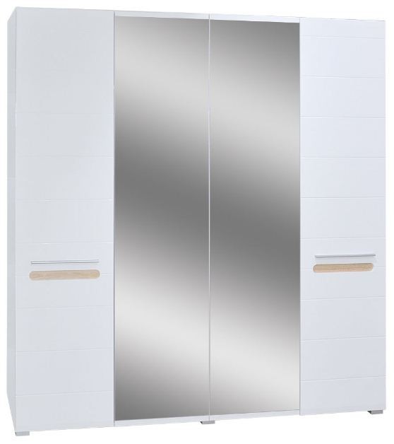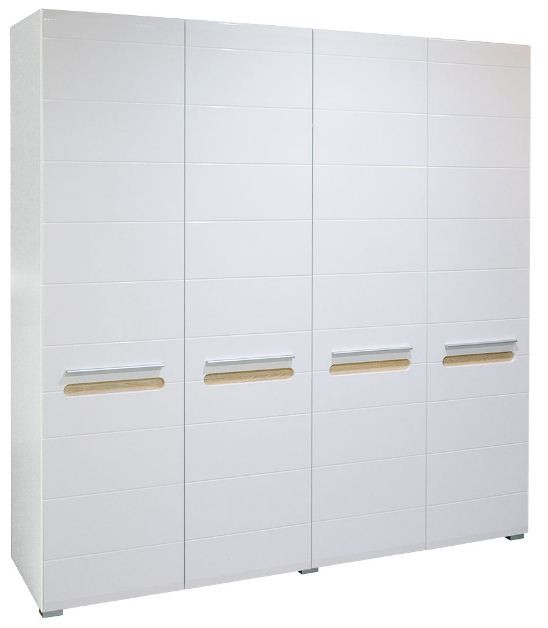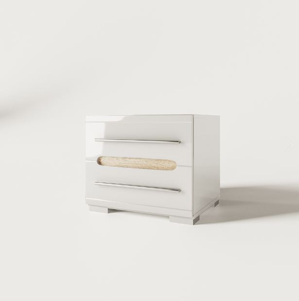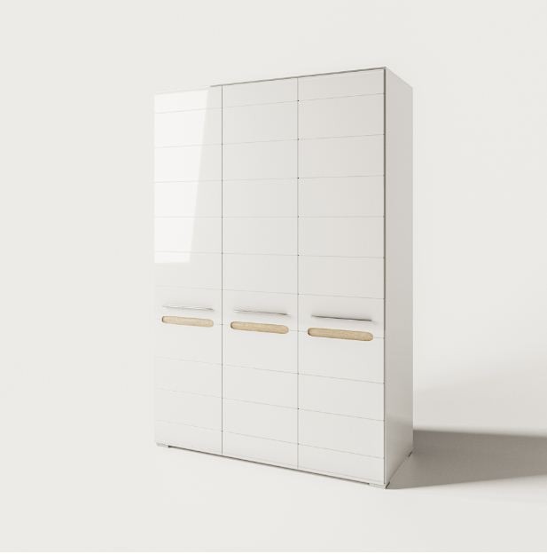 Спальня БЬЯНКО СВІТ МЕБЛІВ – комплект мебели в спальню модульной системы Bianko Svit Mebliv – Украина». Изготавливается в цвете: корпус – белый; фасад – белый глянец / дуб сонома. Характеризуется белоснежными глянцевыми фасадами, наполняющими помещение светом и визуально увеличивающими пространство, оригинальными закругленными вставками с выразительной текстурой древесины и длинными металлическими ручками.
