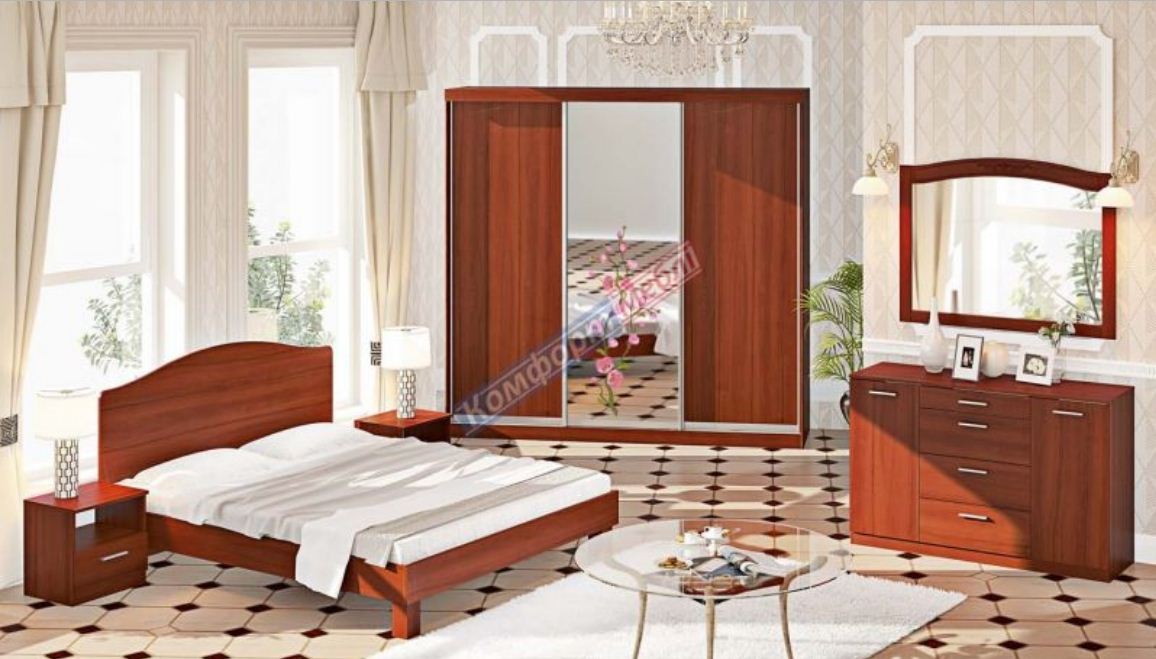 Спальня СП-4504 ЭкоФасад ЛДСП оклеен кромкой ПВХ 0,5 мм. Верхние крышки тумбы и комодов - ЛДСП 16 мм. Ручка стиля хай-тек пластиковая. Цвет корпус: Венге, дуб трюфель, дуб натуральный, дуб беленый, дуб молочный, орех Цвет фасадов: Венге, дуб трюфель, дуб натуральный, дуб беленый, дуб молочный, орех Цвет изголовья: Венге, дуб трюфель, дуб натуральный, дуб беленый, дуб молочный, орех Основа под матрас: ДВП, Ламели Размер спального места: 160 х 200см Размер необходимого матраса : 160 х 200см Комплектация: Комод Д-4592, зеркало М-556, шкаф-купе Ф-5276, кровать К-94, 2 прикроватные тумбы Д-4594. Цена комплекта указана за цвет, который изображен на фото.(Без матраца) Основание под матрас уточнять у менеджера. Рисунок на зеркале дополнительная платная опция